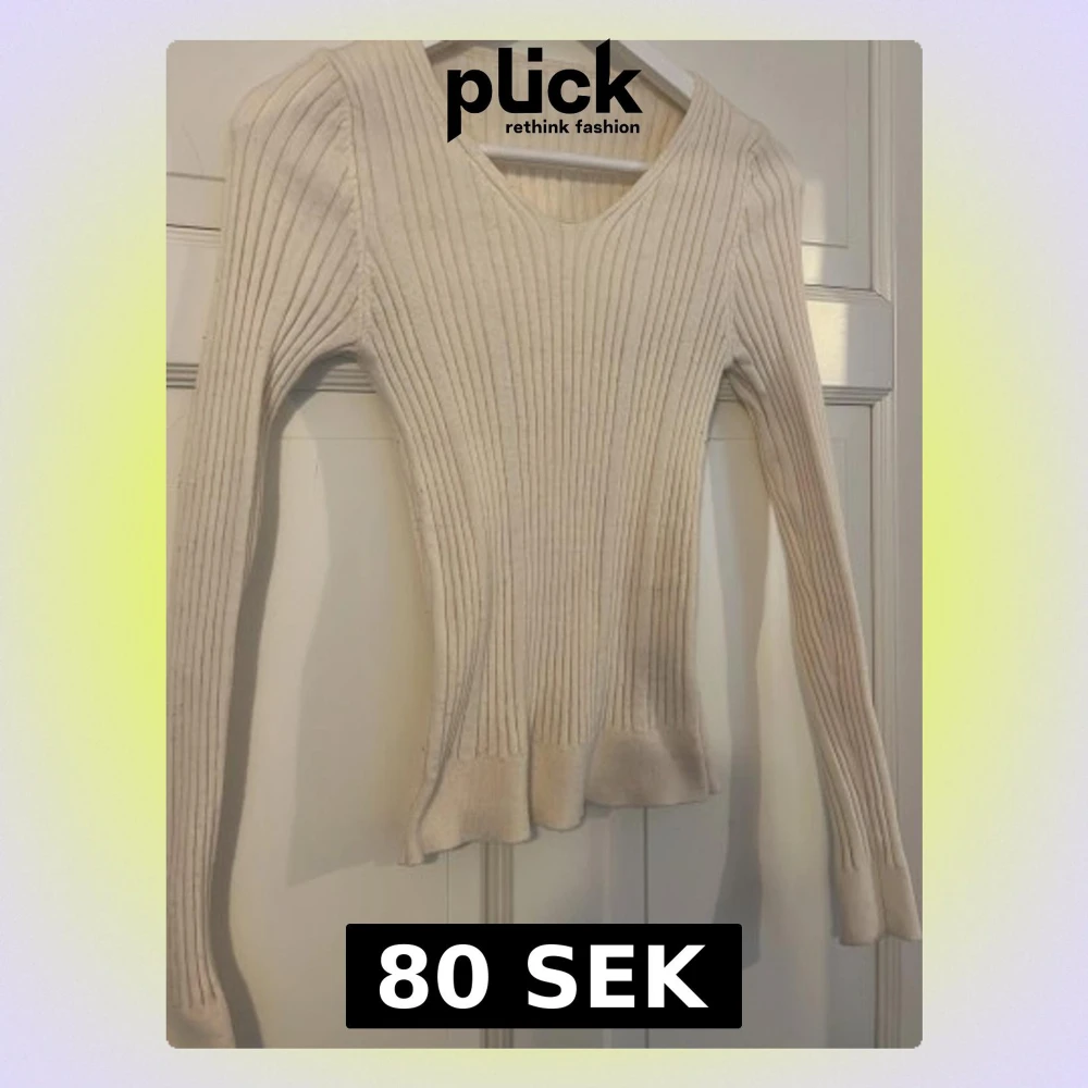 Säljer en vit ribbstickad tröja med v-ringad hals och långa ärmar. Tröjan har figurnära passform och bred ribbad kant nedtill. Perfekt för dig som gillar en enkel men snygg stil. Materialet känns mjukt och stretchigt.