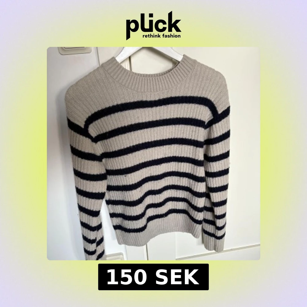 Säljer en snygg beige stickad tröja med marinblåa ränder. Tröjan har en ribbad struktur och långa ärmar, perfekt för kyligare dagar. Den har en klassisk design som passar till många olika stilar.