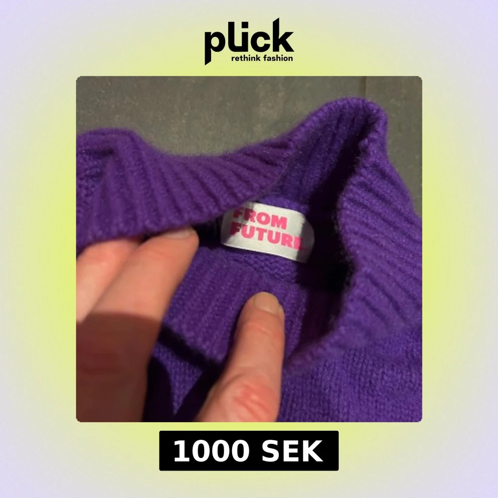 Säljer en snygg lila stickad tröja från From Future med texten 'FUTURE' i vitt på framsidan. Tröjan har en ribbad design och en hög krage som ger extra värme. Perfekt för kyliga dagar!