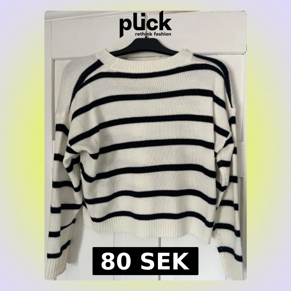 Säljer en vit stickad tröja från SHEIN med svarta horisontella ränder. Tröjan har rund halsringning, långa ärmar och ribbade muddar vid ärmslut och nederkant. Perfekt för en avslappnad och trendig look.