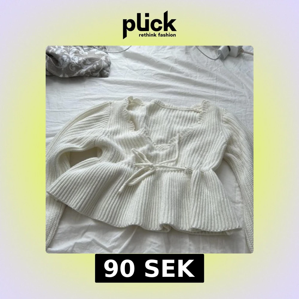 Säljer en söt vit stickad tröja med knyt i midjan och volangdetaljer vid halsen. Tröjan har långa ärmar och en ribbad struktur som ger en fin passform. Perfekt för kyliga dagar!