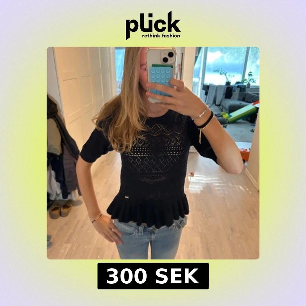 Supersöt mörkblå stickad topp från Holly & White med korta ärmar och volangkant nedtill. Tröjan har ett snyggt hålmönster som gör att hela tröjan blir finare. Köpte den för länge sen men har aldrig använt den. Den är en skit snygg tröja och är så fin på kroppen