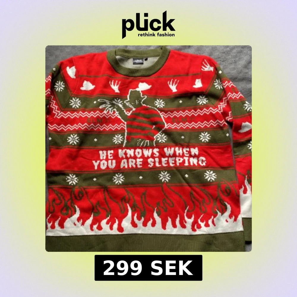 Säljer en grön och röd stickad jultröja med Freddy Krueger-motiv och texten 'He knows when you are sleeping'. Tröjan har snöflingor, eldflammor och vita detaljer, samt klassiskt crewneck. Perfekt för skräckfilmsfans som vill sticka ut på julfesten.