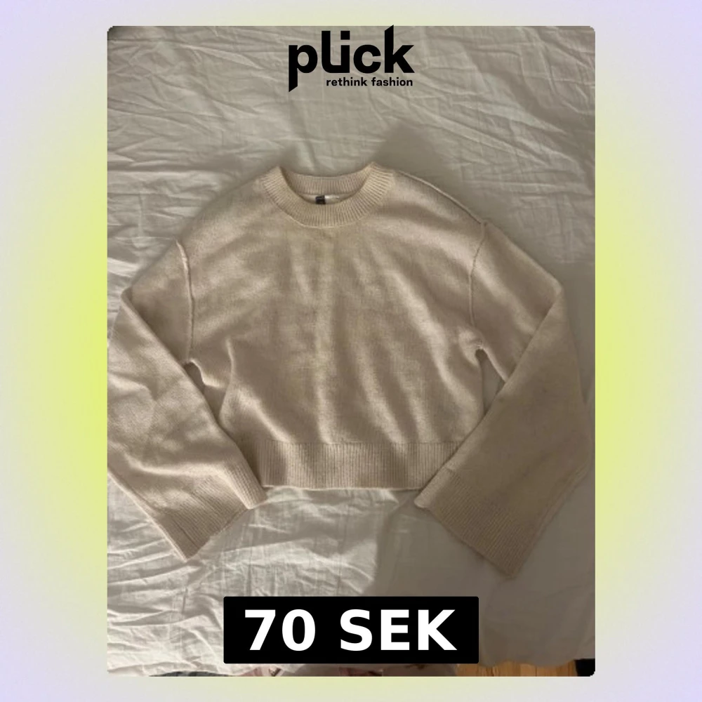 Säljer en beige croppad stickad tröja från H&M Divided. Tröjan har breda ribbade muddar vid ärmslut och nederkant, rund halsringning och lång ärm. Perfekt till lager på lager och enkel att styla till olika outfits.