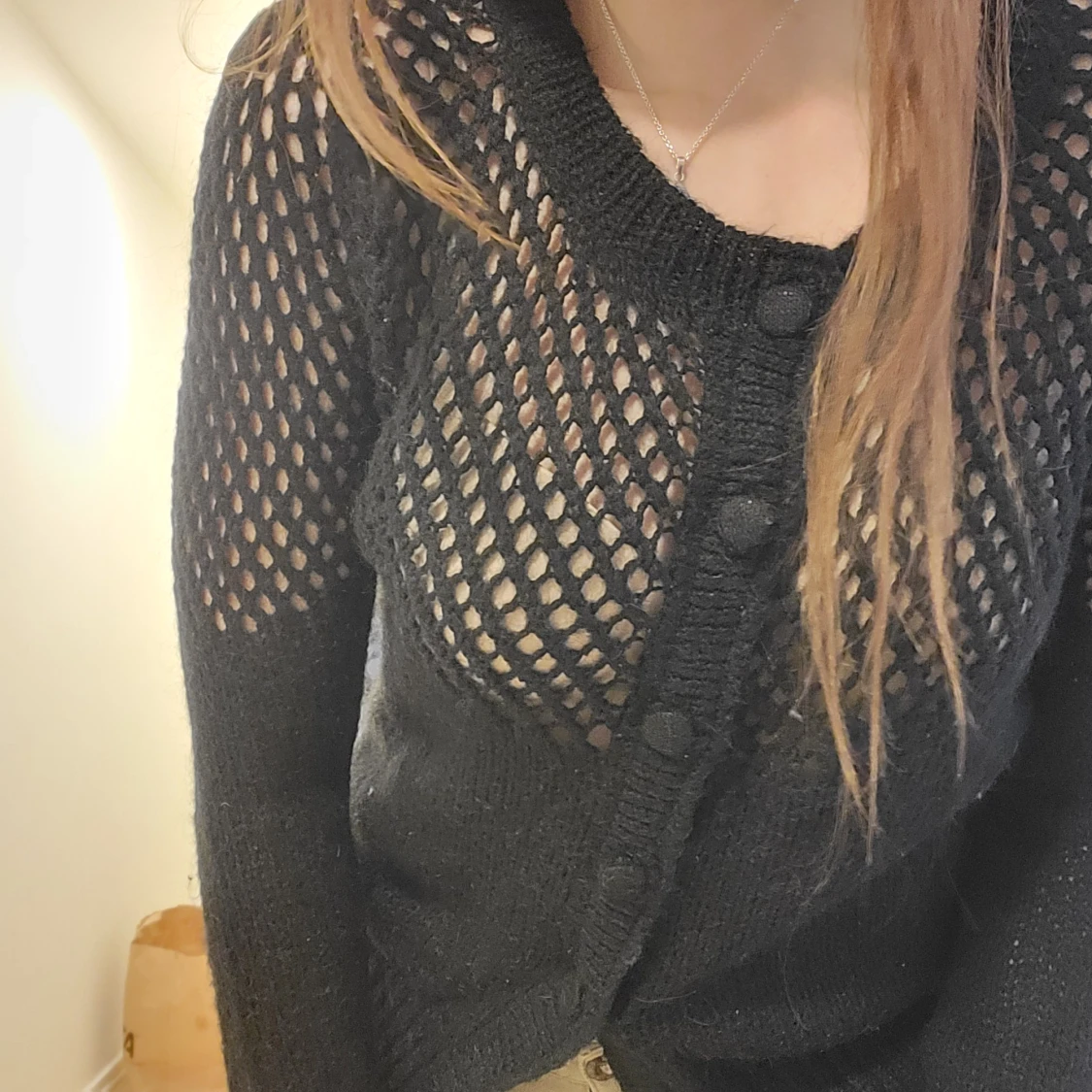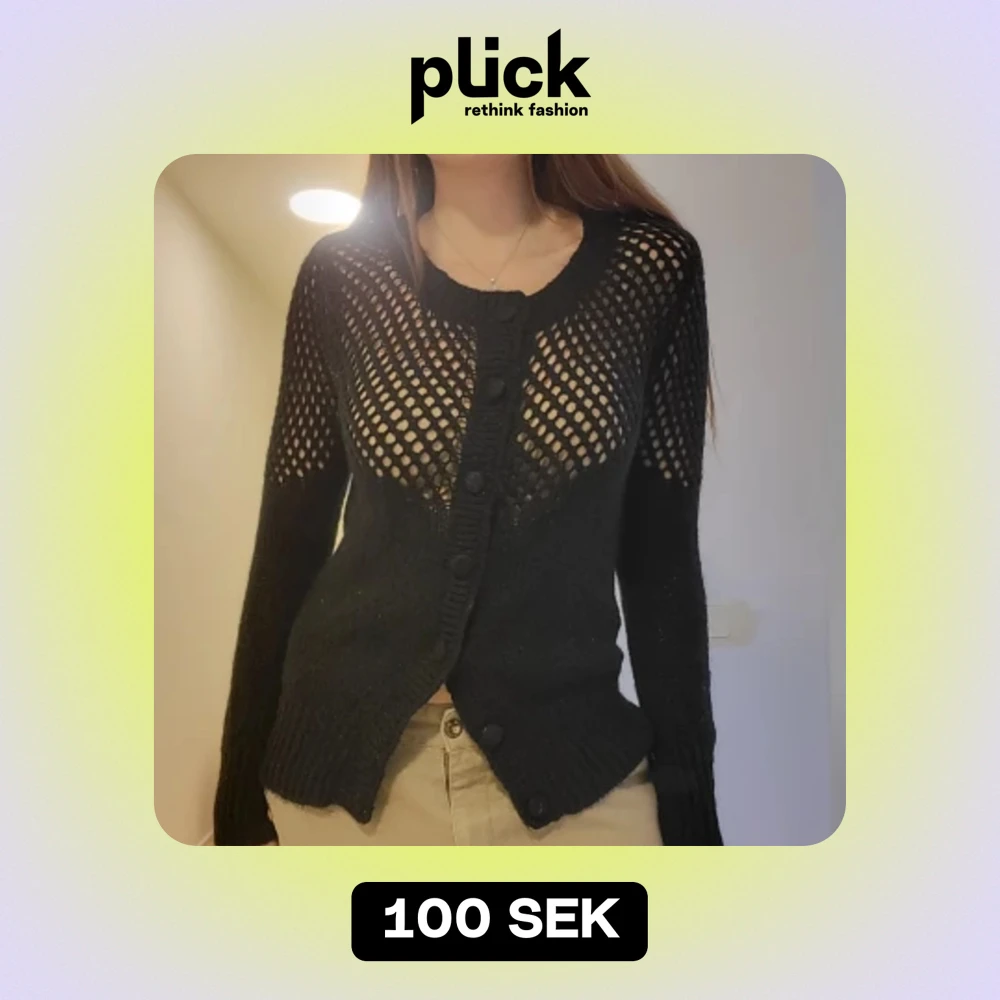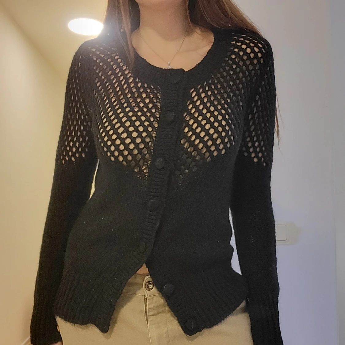 Inköpt mellan år 2000-2010. Svart stickad y2k tröja med öppningar längs axlarna samt knappar framtill. Väldigt häftig både till jeans och kjol. Superskick! Passar S och XS. Svarar på alla frågor.
