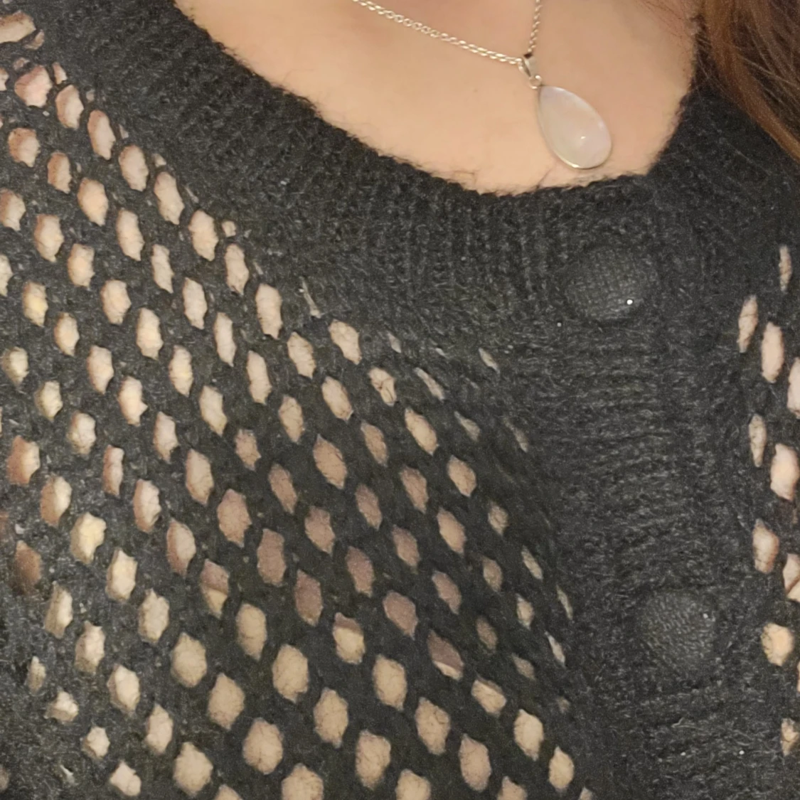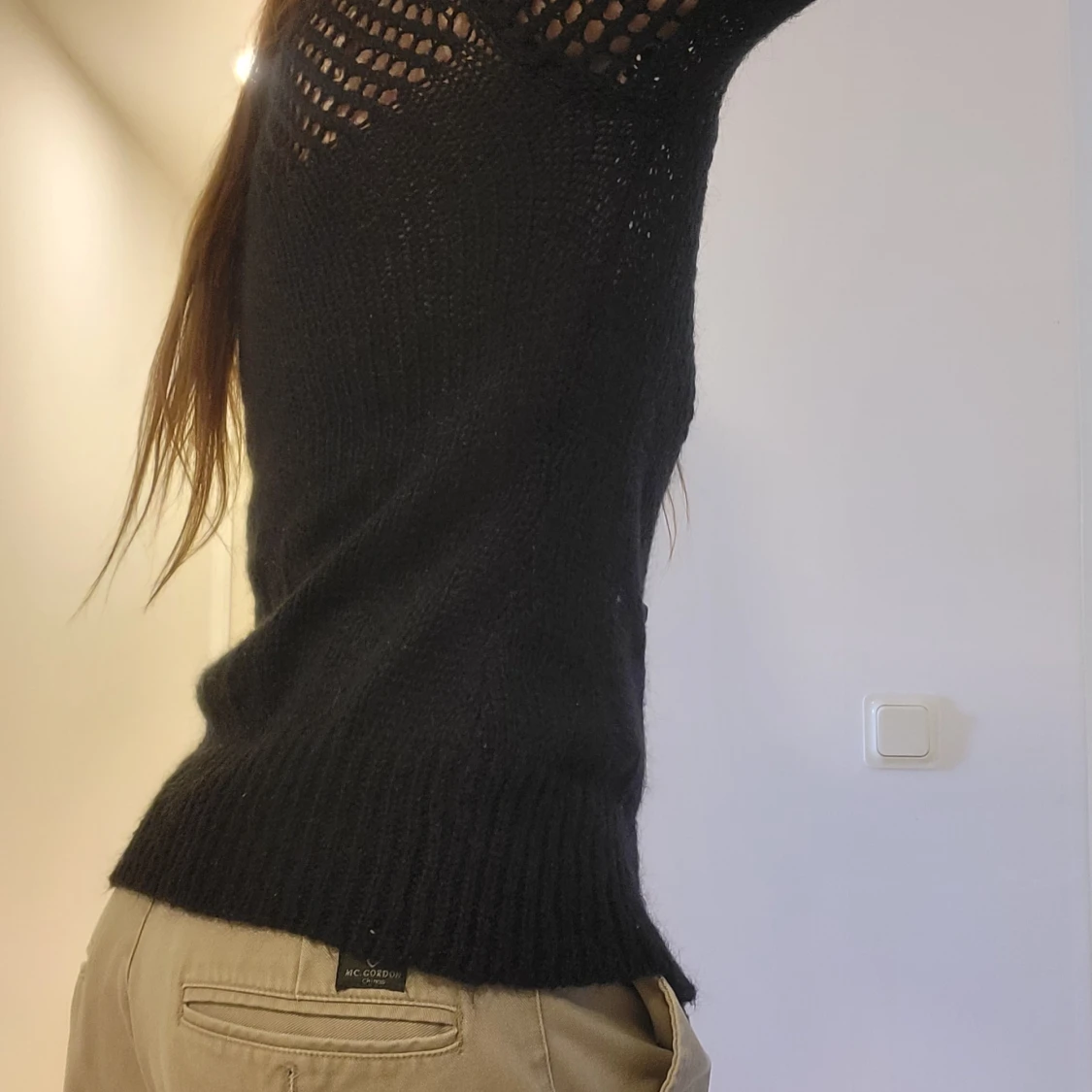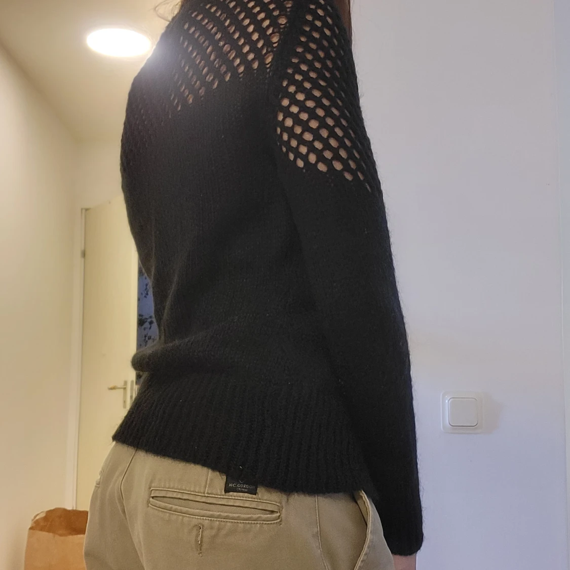 Inköpt mellan år 2000-2010. Svart stickad y2k tröja med öppningar längs axlarna samt knappar framtill. Väldigt häftig både till jeans och kjol. Superskick! Passar S och XS. Svarar på alla frågor.