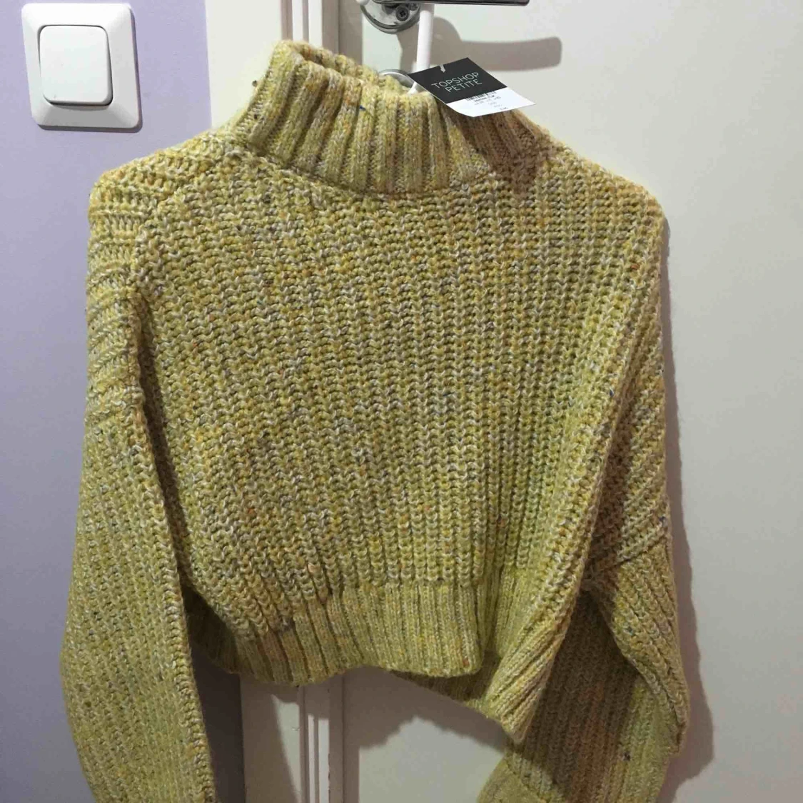 Senapsgul stickad tröja i kort modell. Nyligen inköpt men aldrig använd, prislappen sitter på. Stl 38 passar en S.
