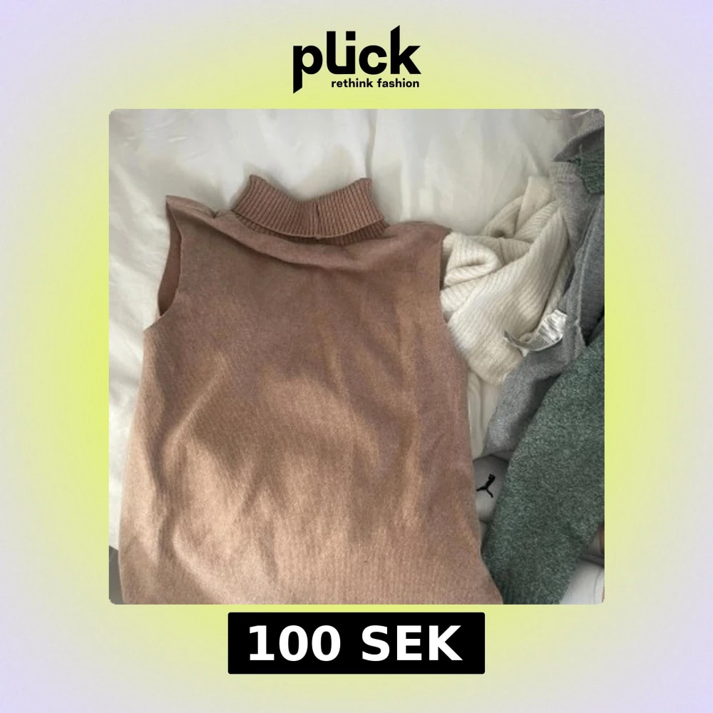 Säljer en beige stickad väst med hög polokrage. Västen är ärmlös och har en mjuk, ribbad struktur vid halsen. Perfekt att styla över en skjorta eller långärmad tröja.