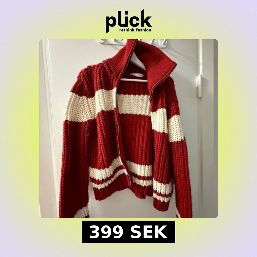 Säljer en chunky stickad kofta från Zara i rött och vitt med breda ränder. Koftan har dragkedja framtill, hög krage och långa ärmar. Perfekt för både kalla dagar och sommarkvällar🌟🌟🌟
