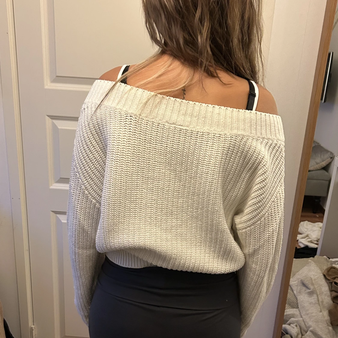 En vit stickad tröja som passar till alla kläder och olika tillfällen. Helt ok skick.