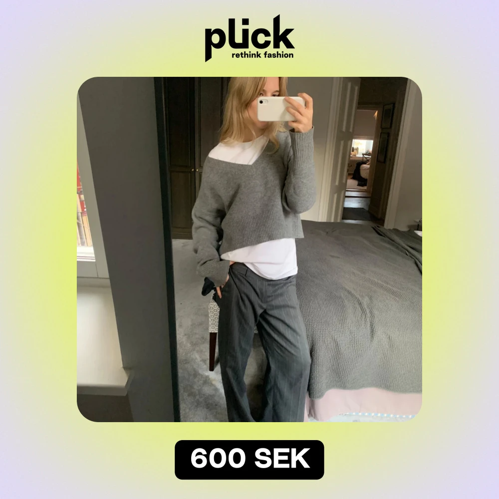 Säljer en supermysig grå croppad stickad tröja med v-ringning. Perfekt för lager-på-lager looken eller att ha för sig själv lite off-shoulder. 100% cashmere, sååå himla skön och snygg!