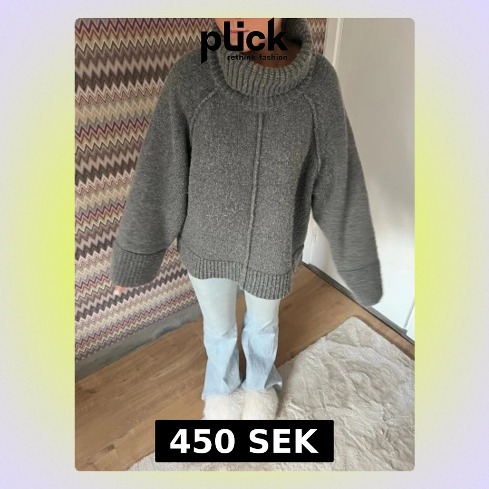 Mysig grå stickad polotröja med oversized passform och breda ärmar. Tröjan har en hög, ribbad polokrage och ribbade muddar vid ärmslut och nederkant. Perfekt för kalla dagar och enkel att styla till jeans eller kjol. Något nopprig men den var även det när man köpte så tror lite är meningen