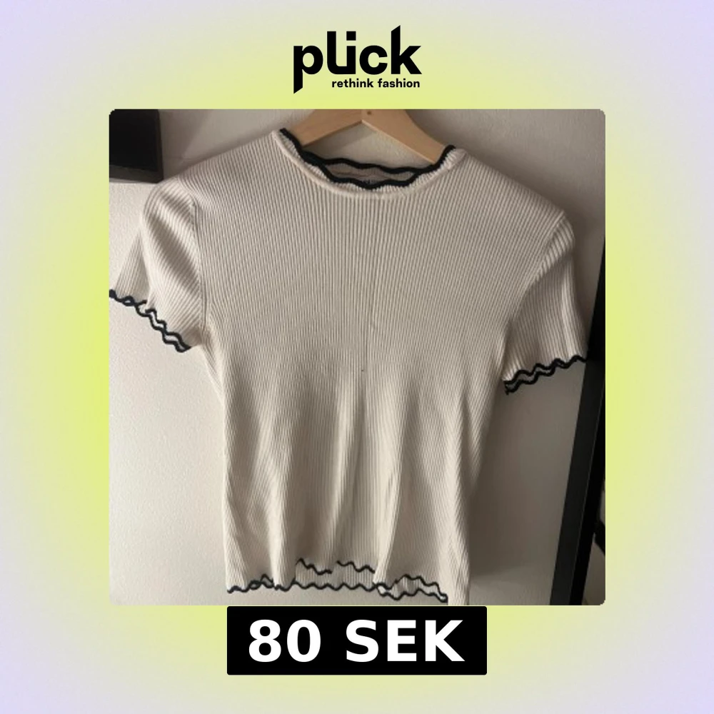 Säljer en vit ribbad topp från Zara med korta ärmar och svarta vågiga kanter vid hals, ärmslut och nederkant. Toppen är i stickad material och har en slim passform som sitter snyggt. Perfekt för dig som gillar minimalistisk stil med en twist.