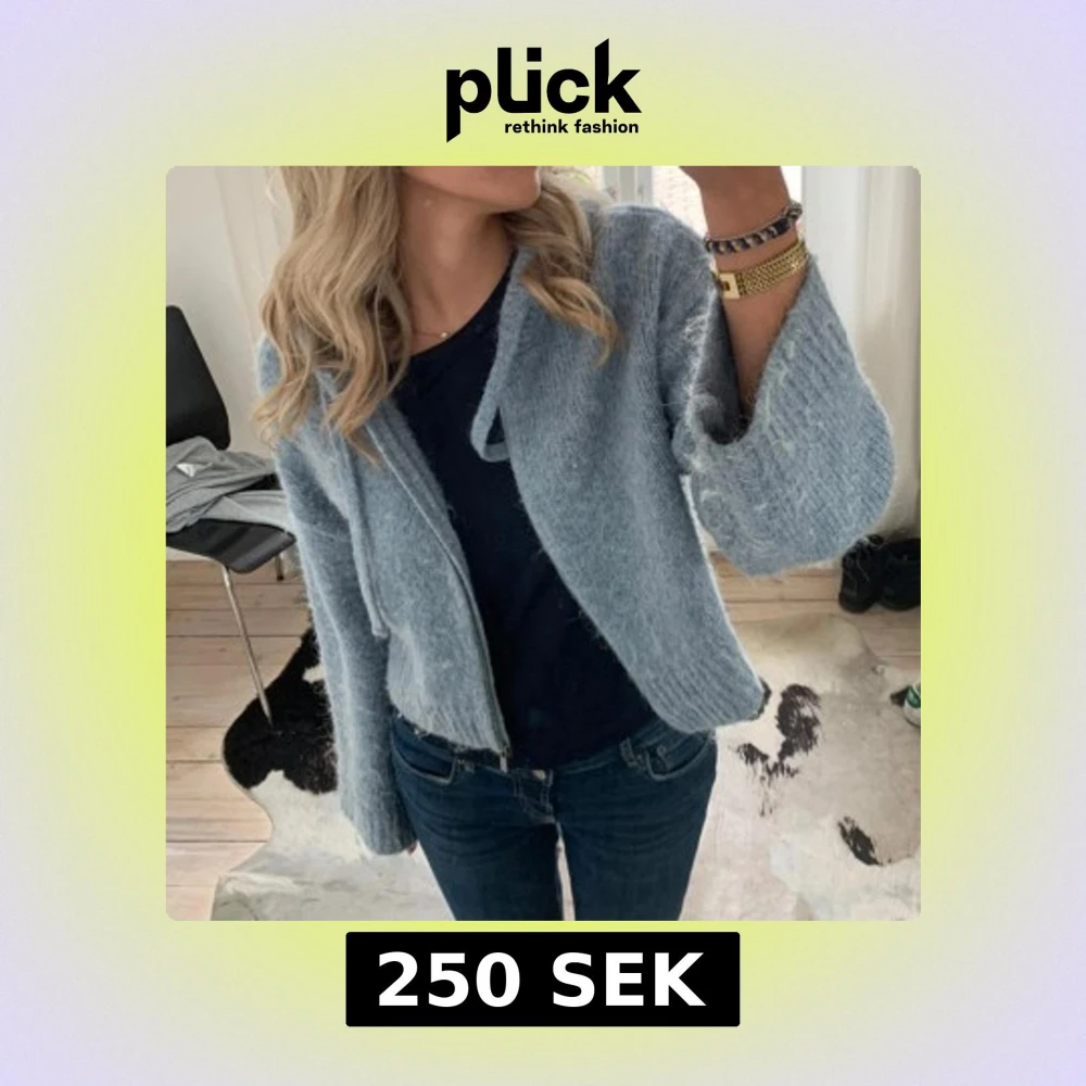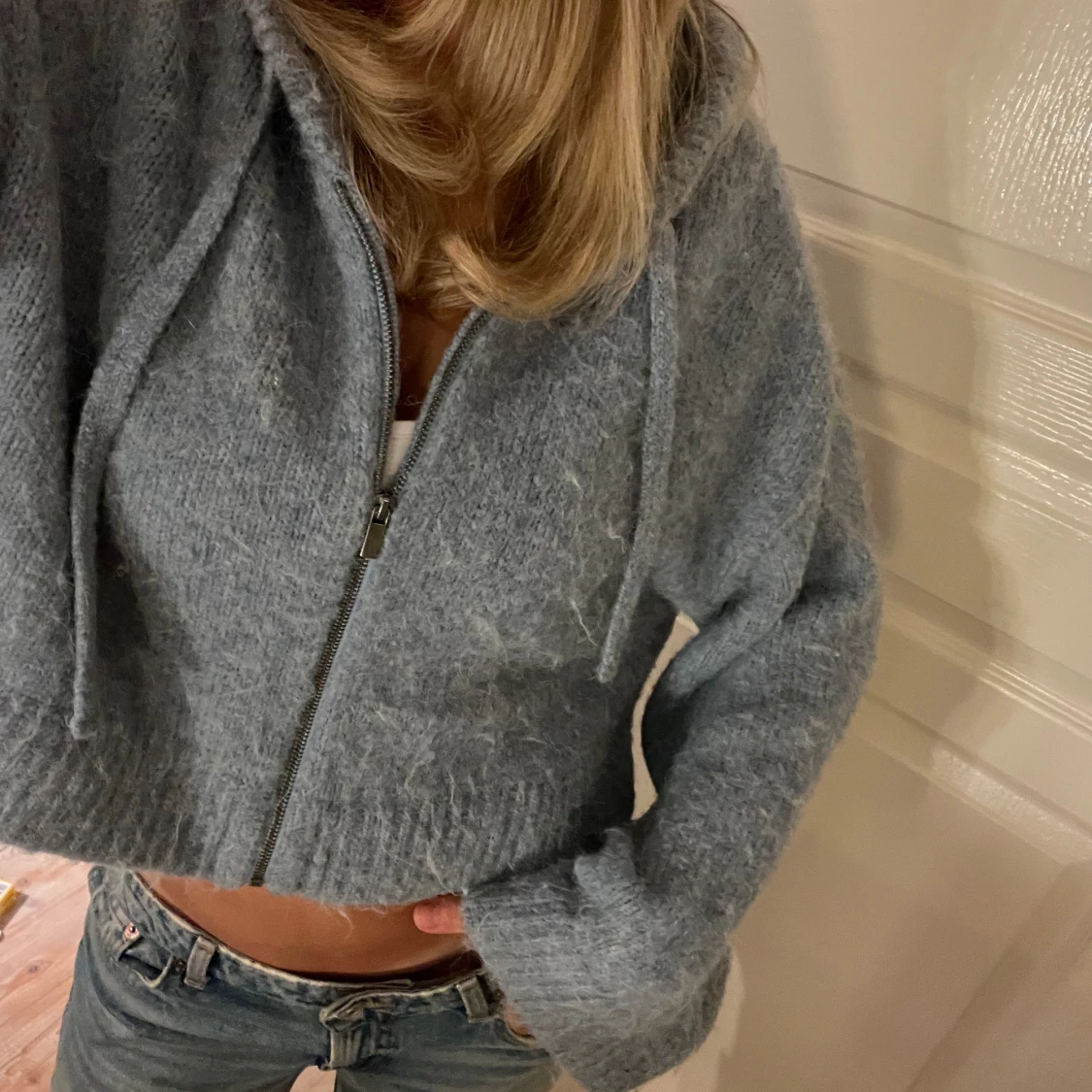 Blå stickad tröja med dragkedja och luva från Zara! Fint skick, använt några gånger bara💗Själva materialet är ”fluffigt” så det är inte som det är nopprigt utan köpte den så!! Storlek M-L, men själva modellen är kort.