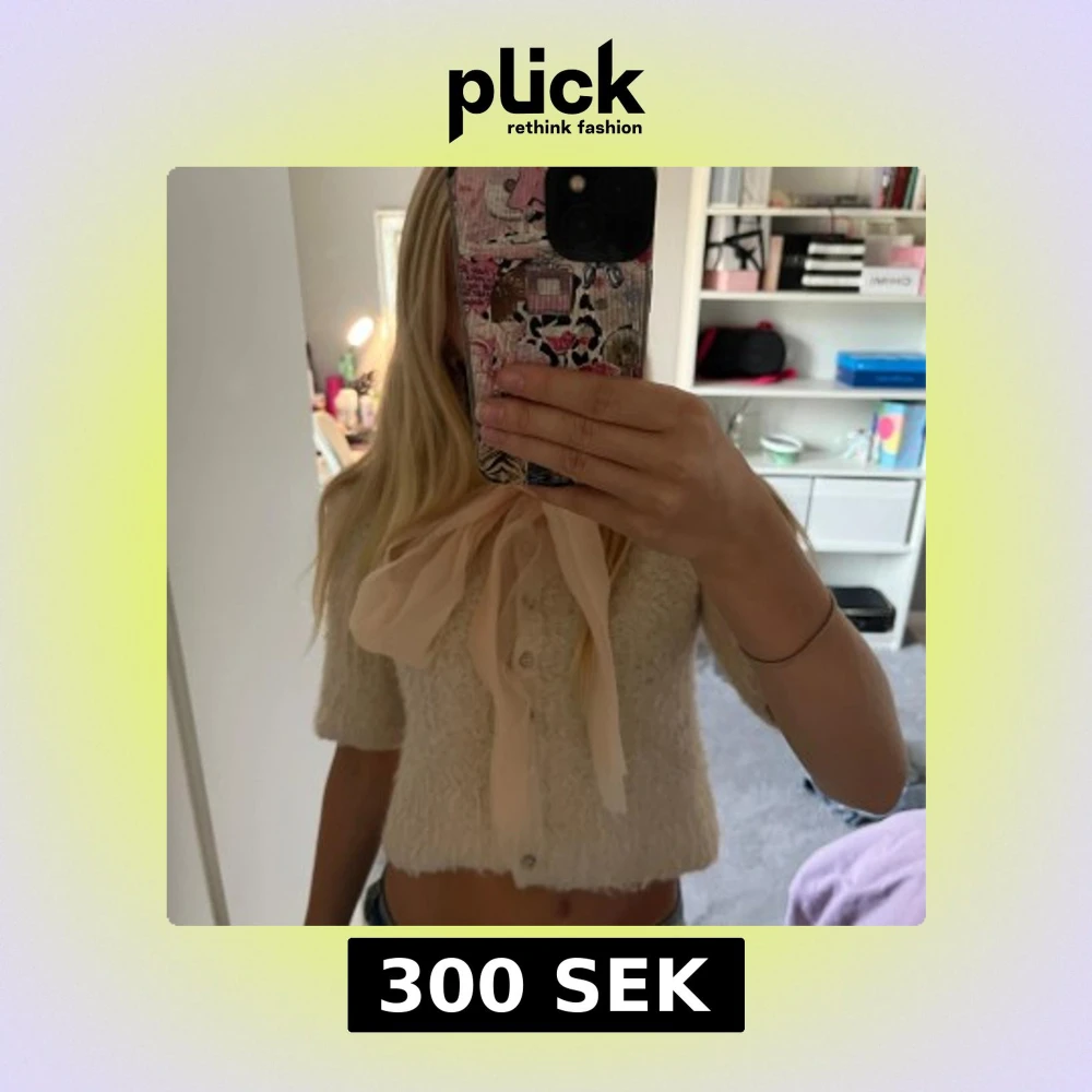 Superfin beige stickad blus från Zara med korta ärmar och stora knappar framtill. Söt och stor rosett i ljusrosa vid halsen som ger en gullig touch. Croppad modell som passar perfekt till jeans eller kjol. Mindre än normalt i storleken så sitter som S!💞 Säljer pågrund av att den inte kommer gilla användning