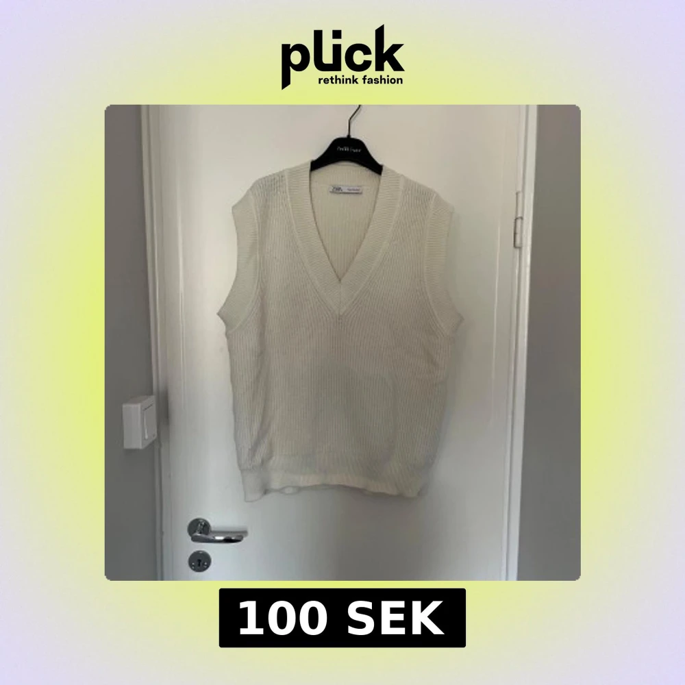 Vit stickad väst från Zara med djup v-ringning och är ribbad. Klassisk och enkel design som är lätt att styla över en skjorta eller t-shirt. Knappt använd i strl S