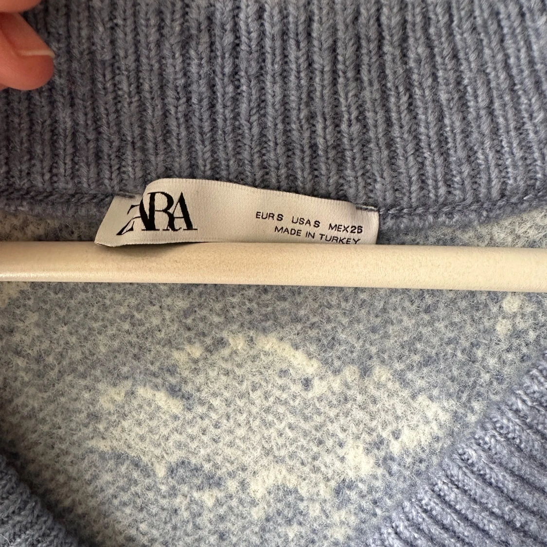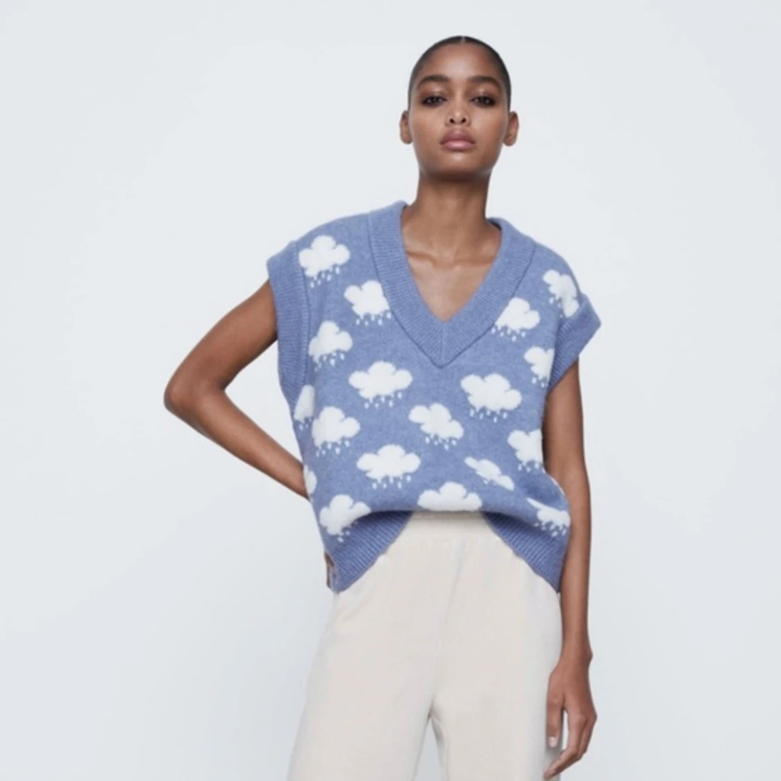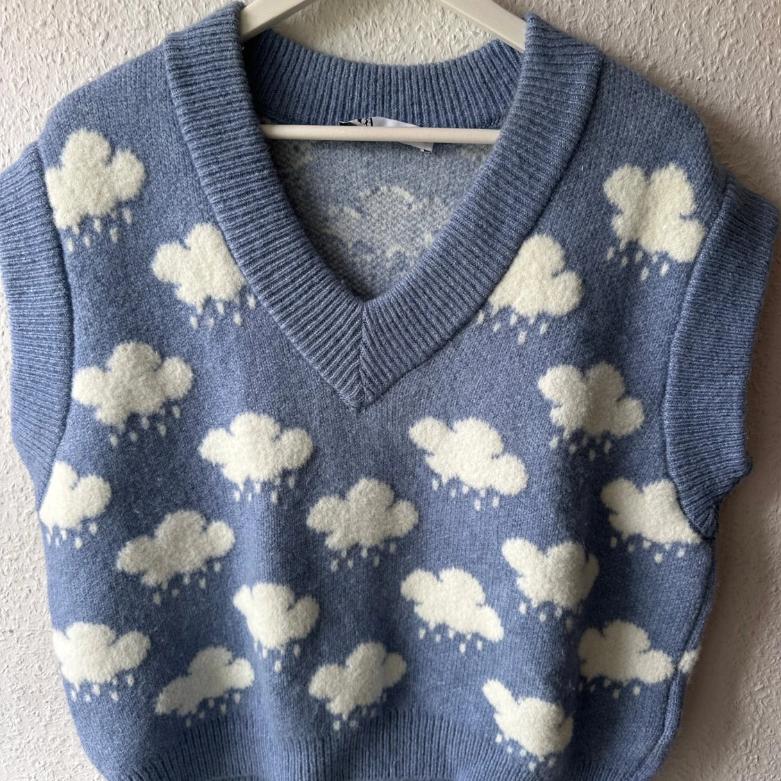 Superfin blå stickad väst från Zara med vita moln och regndroppar över hela. Djup v-ringning och bred ribbad kant vid hals och ärm.