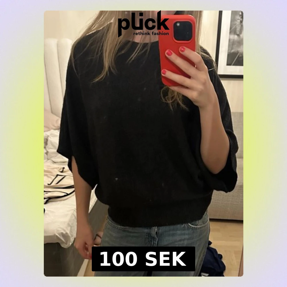 Säljer en svart oversized stickad tröja med bred passform och halvlånga ärmar. Tröjan har rund halsringning och ribbade muddar vid hals och nederkant. Perfekt för en avslappnad och trendig look.