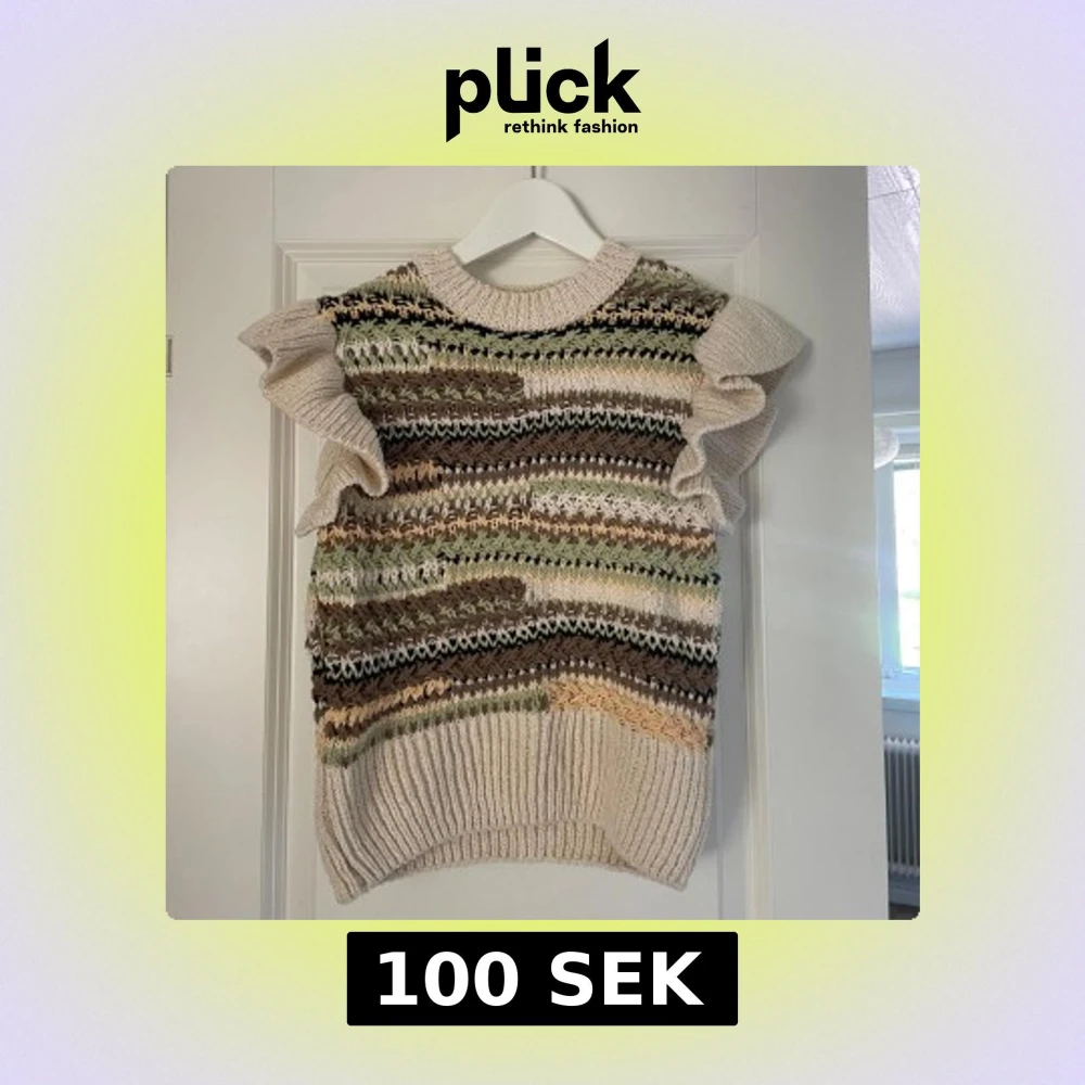 Säljer en unik stickad väst med volangärmar i beige, brunt och grönt. Västen har ett mönster med olika färgblock och ribbad nederkant.