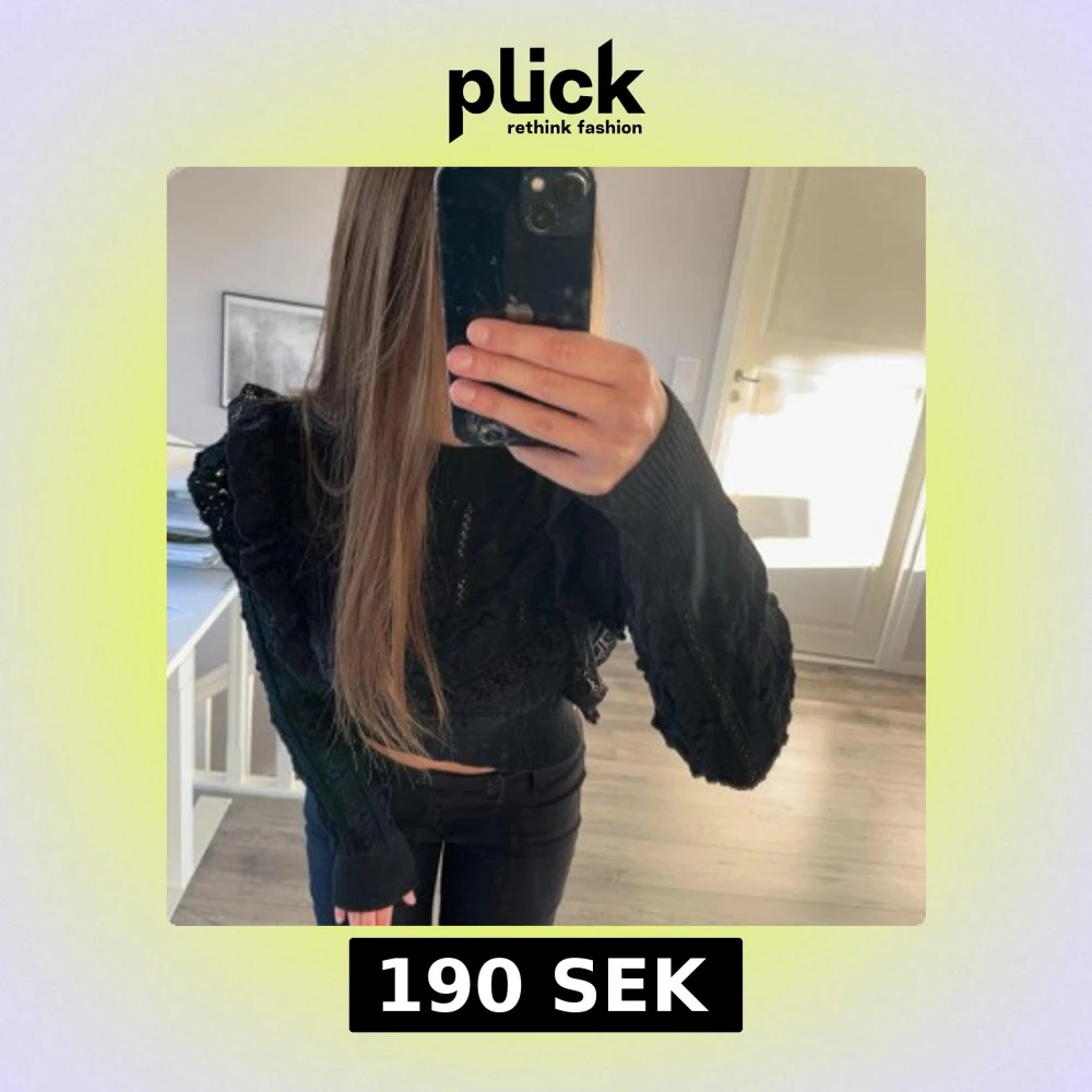 Säljer en svart stickad tröja från Zara med snygga virkade detaljer och volanger framtill. Säljer då jag inte får användning av den längre.