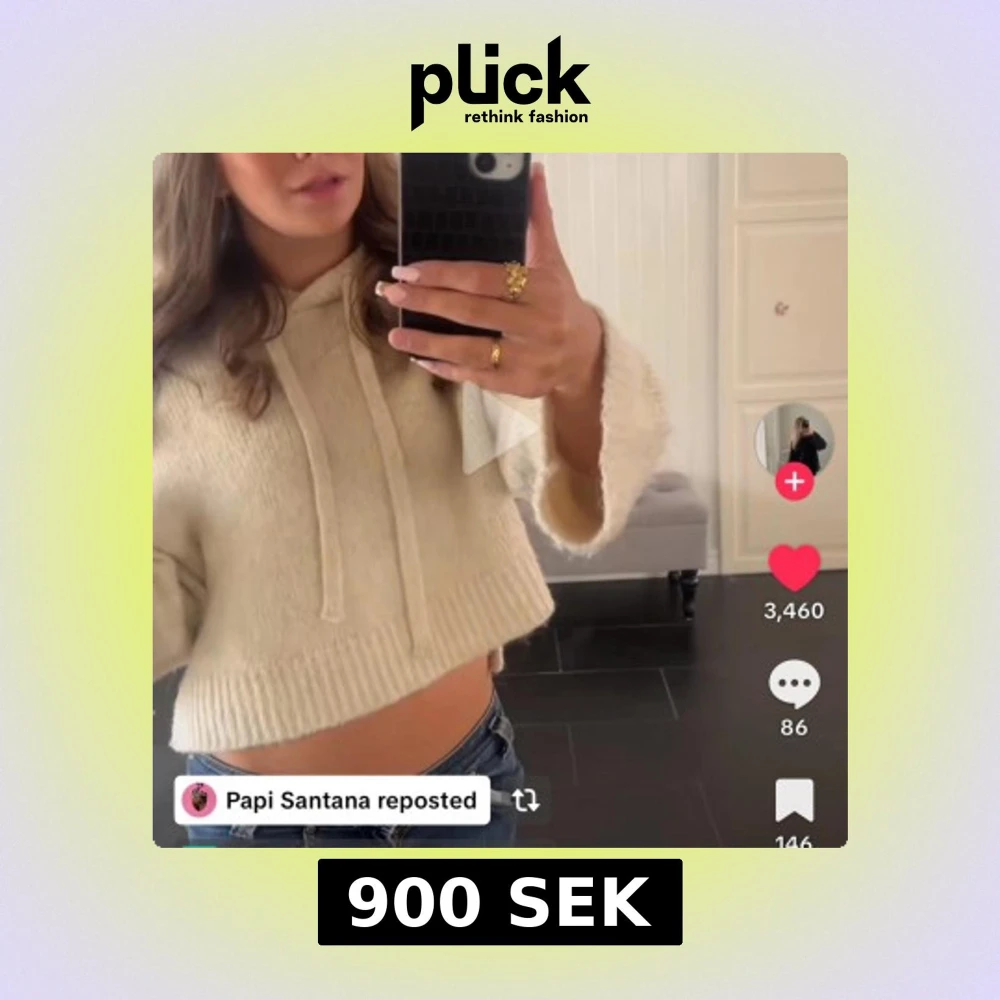 Supermysig beige croppad hoodie med huva och snörning. Tröjan är stickad och har vida ärmar för en chill och trendig look. Perfekt för lager på lager under höst och vinter.