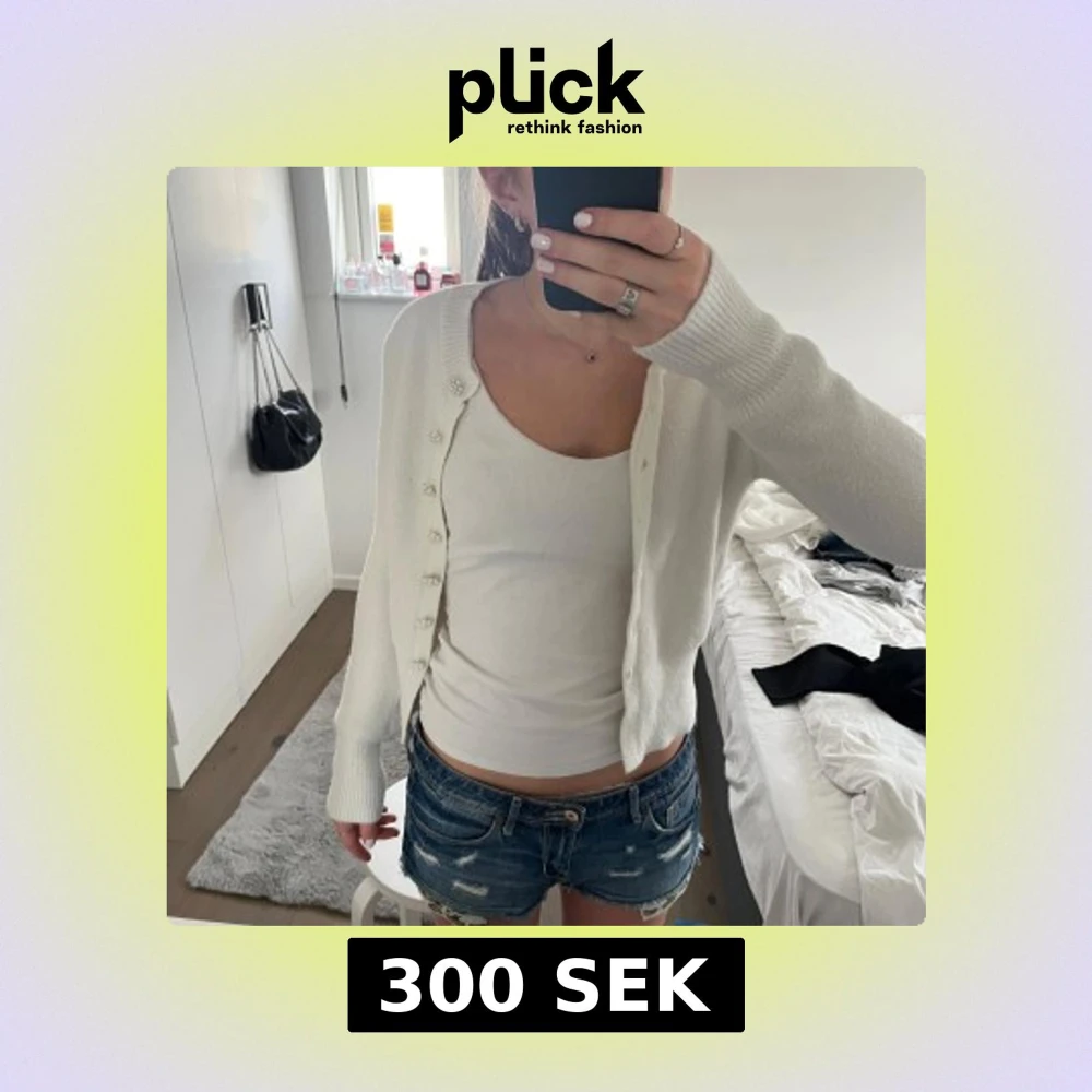 Säljer en söt vit kofta med unika pärlknappar. Koftan är stickad och har lång ärm, perfekt för lager-på-lager. Enkel att matcha till olika outfits och ger en stilren look.