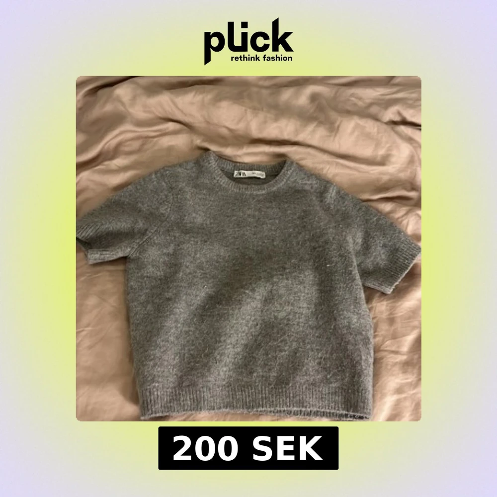 Mysig grå stickad tröja från Zara i storlek S. Tröjan har korta ärmar, rund halsringning och ribbade muddar vid ärmslut och nederkant. Perfekt för lager-på-lager och chill vibes.