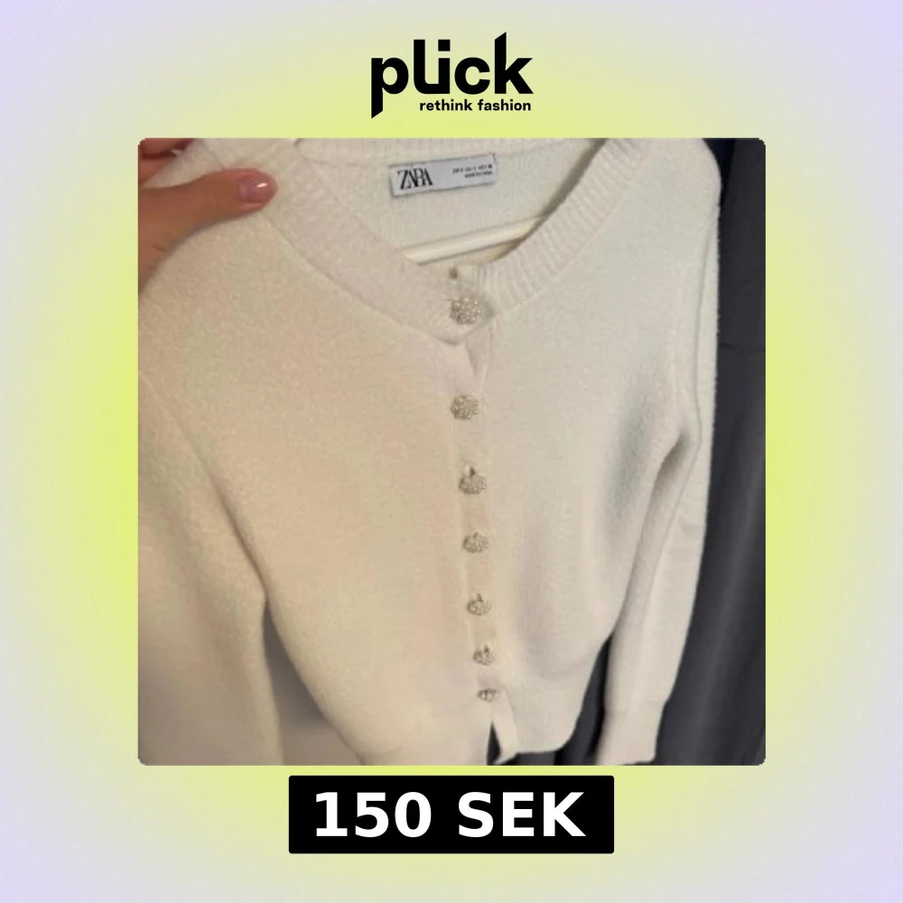 Superfin vit kofta från Zara med långa ärmar och snygga pärlknappar framtill. Mjuk och lite fluffig känsla, perfekt till jeans eller kjol. Rund halsringning och ribbade muddar ger en clean look. Enkelt att styla för en trendig vibe.