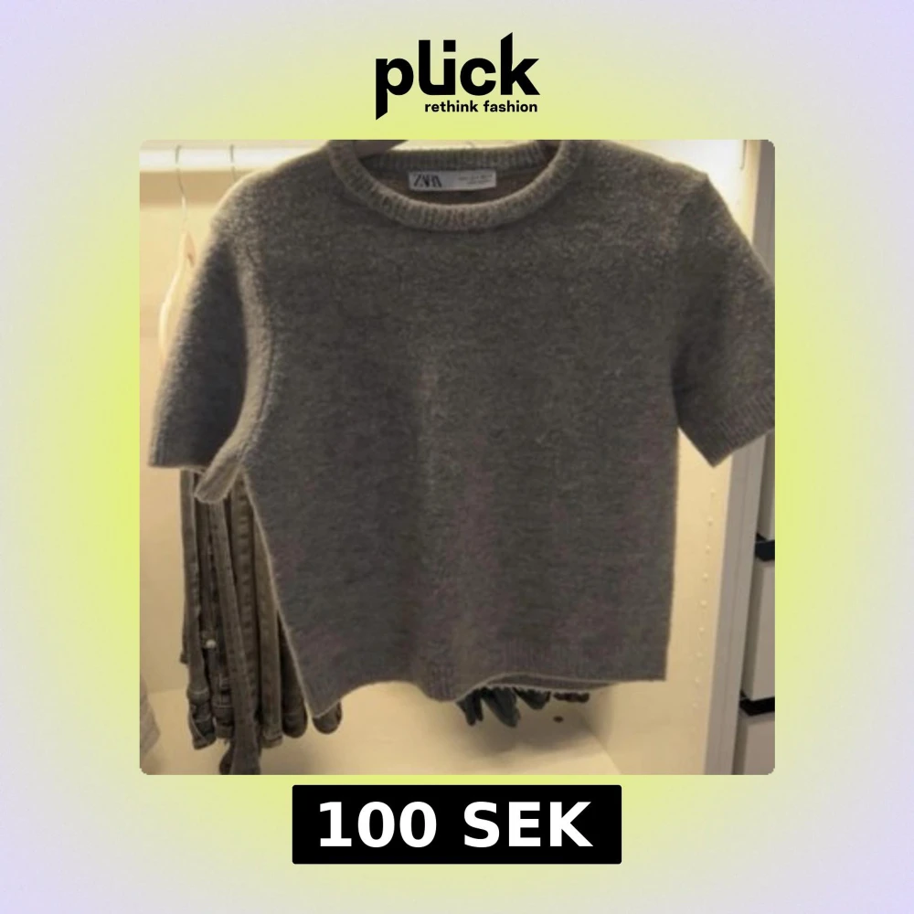 Mysig grå stickad tröja från Zara i storlek S. Tröjan har korta ärmar, rund halsringning och ribbade kanter. Perfekt för lager-på-lager och funkar året runt när du vill ha något enkelt men ändå stilrent.
