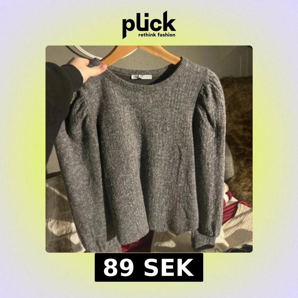 Säljer en grå stickad tröja med ribbad struktur och puffade axlar. Tröjan har rund hals och långa ärmar, perfekt för dig som gillar enkel men snygg stil. Passar dig som vill ha något bekvämt och trendigt.