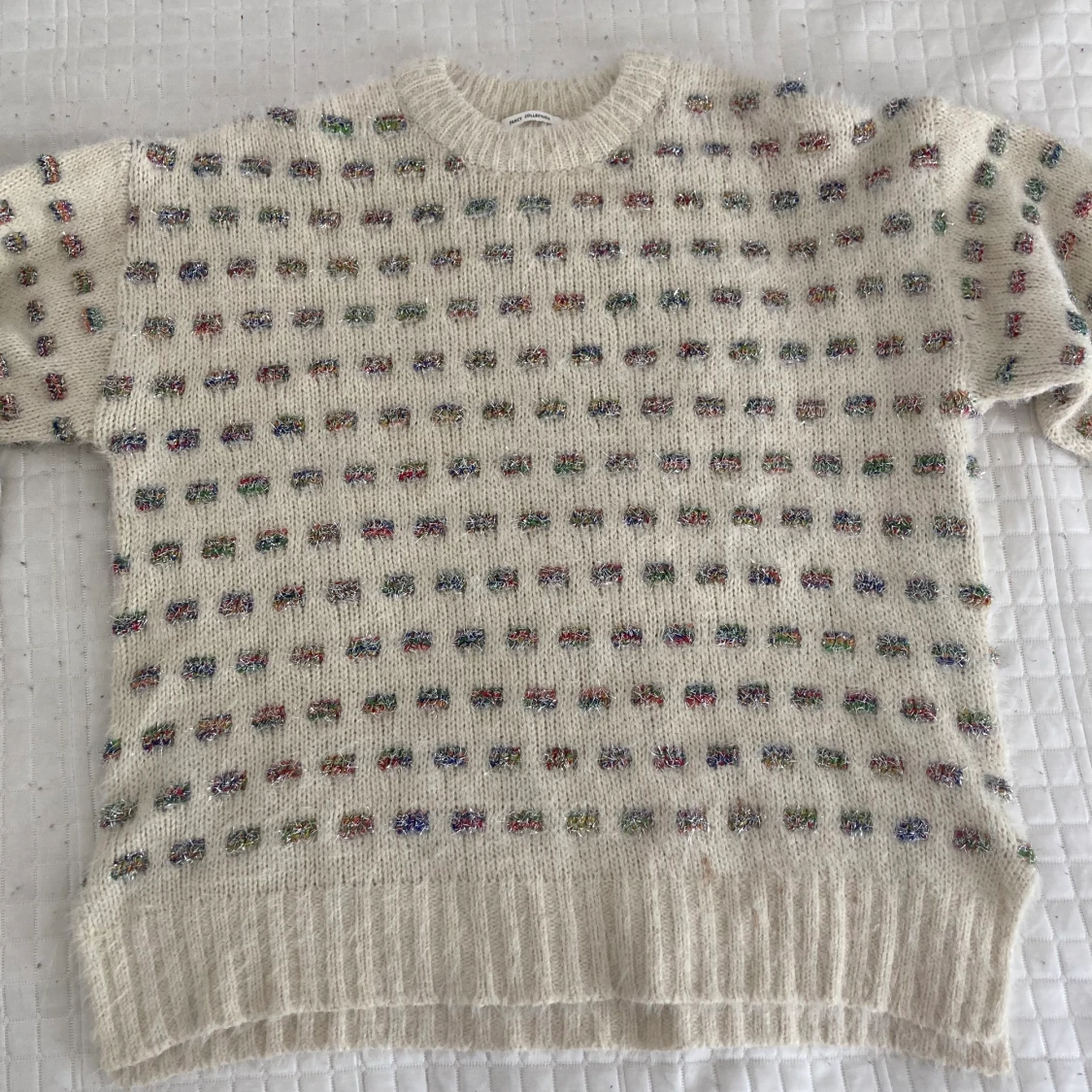 Jättegosig stickad tröja från Zara! Den är beige med glitter mönster dock Inte alls stickig i materialet, storlek S men känns som M. I princip nyskick och säljer då den inte kommer till användning. Nypris 500kr, säljer för 300 men pris går att diskutera😌