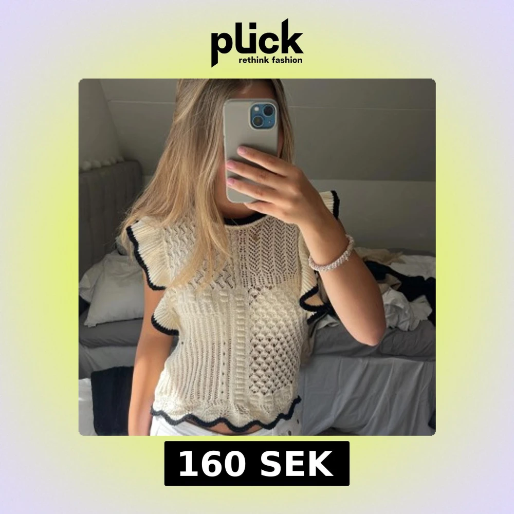 Supersöt stickad ströjs från Zara i offwhite med svarta kanter. Tröjan har volangdetaljer längs ärmhål och nederkant samt ett unikt virkat mönster framtill och baktil. Klicka gärna på ”köp nu”!