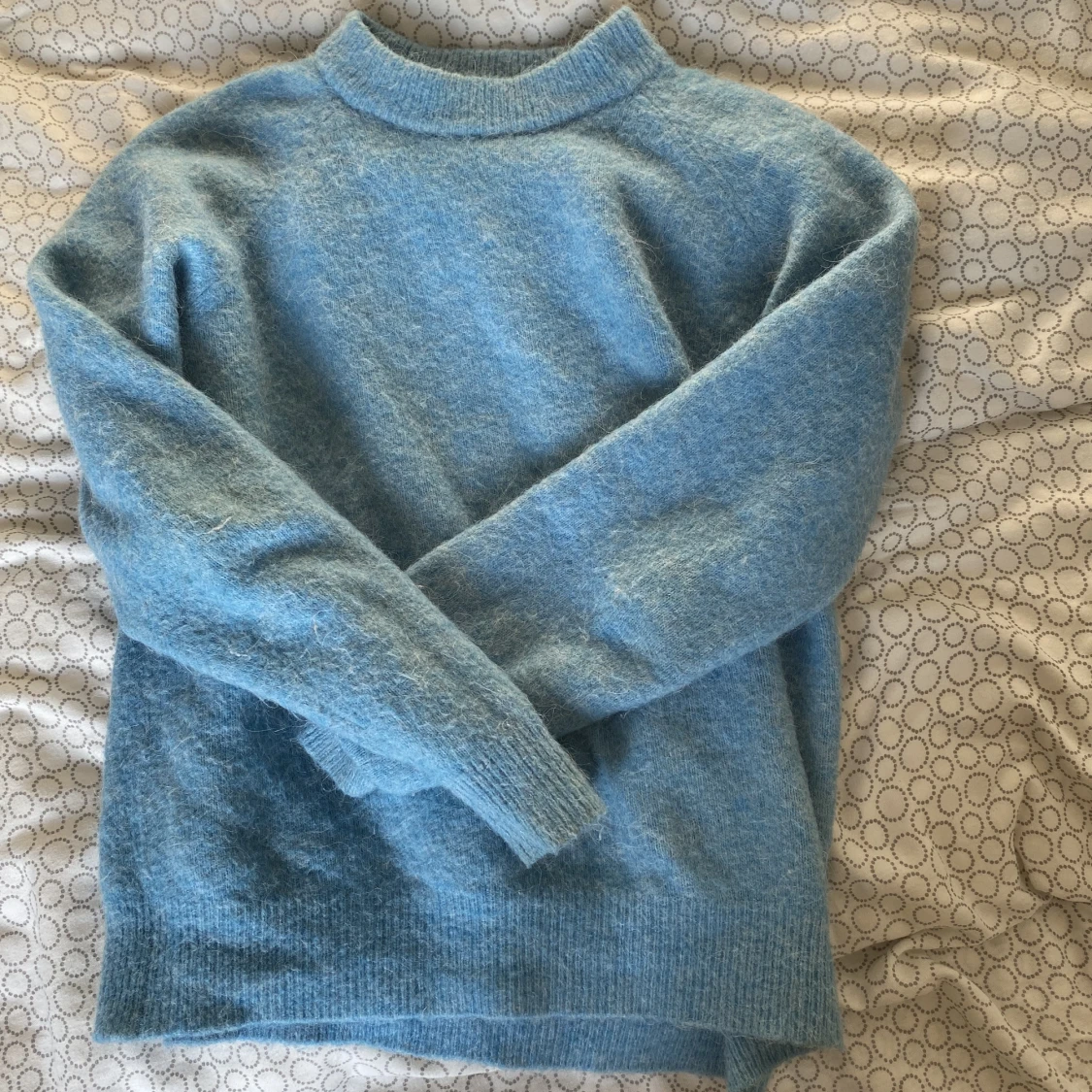 Stickad tröja i blå färg. Storlek S.