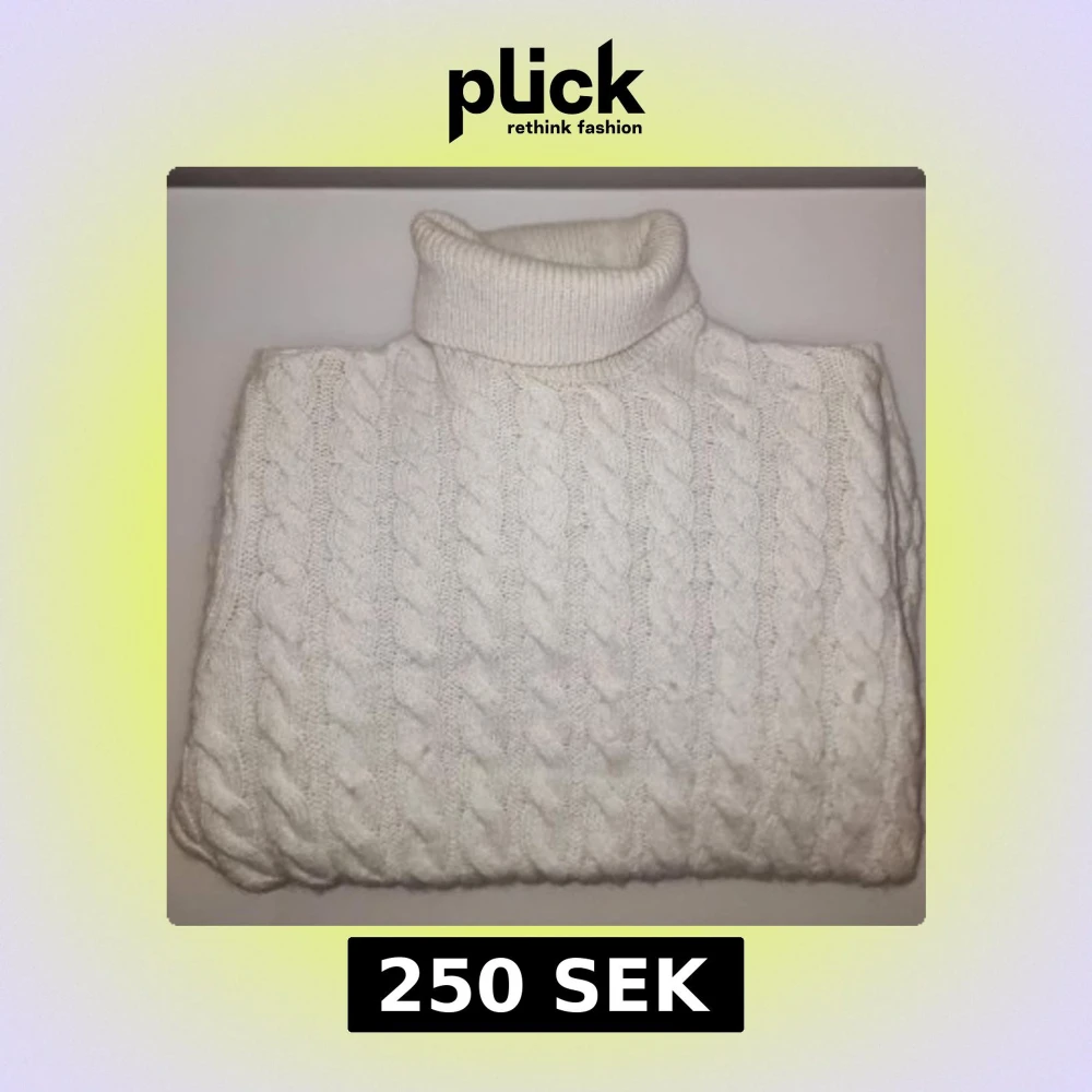 Säljer en stilren vit stickad polotröja med klassiskt flätmönster. Tröjan har långa ärmar och en hög polokrage som håller dig varm under kyliga dagar.