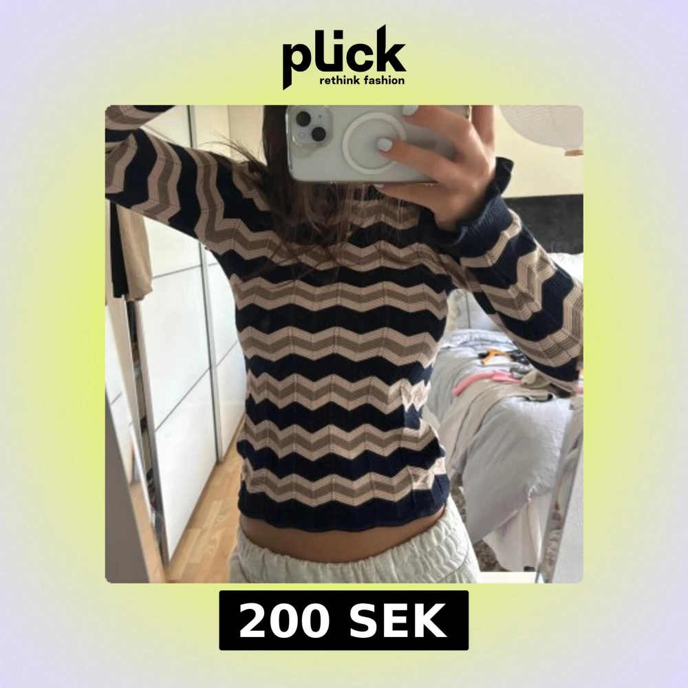 Säljer en stickad tröja med vågiga ränder i beige och marinblått. Tröjan har lång ärm, rund halsringning och sitter figurnära. Perfekt för dig som gillar retrovibbar och snygga mönster.