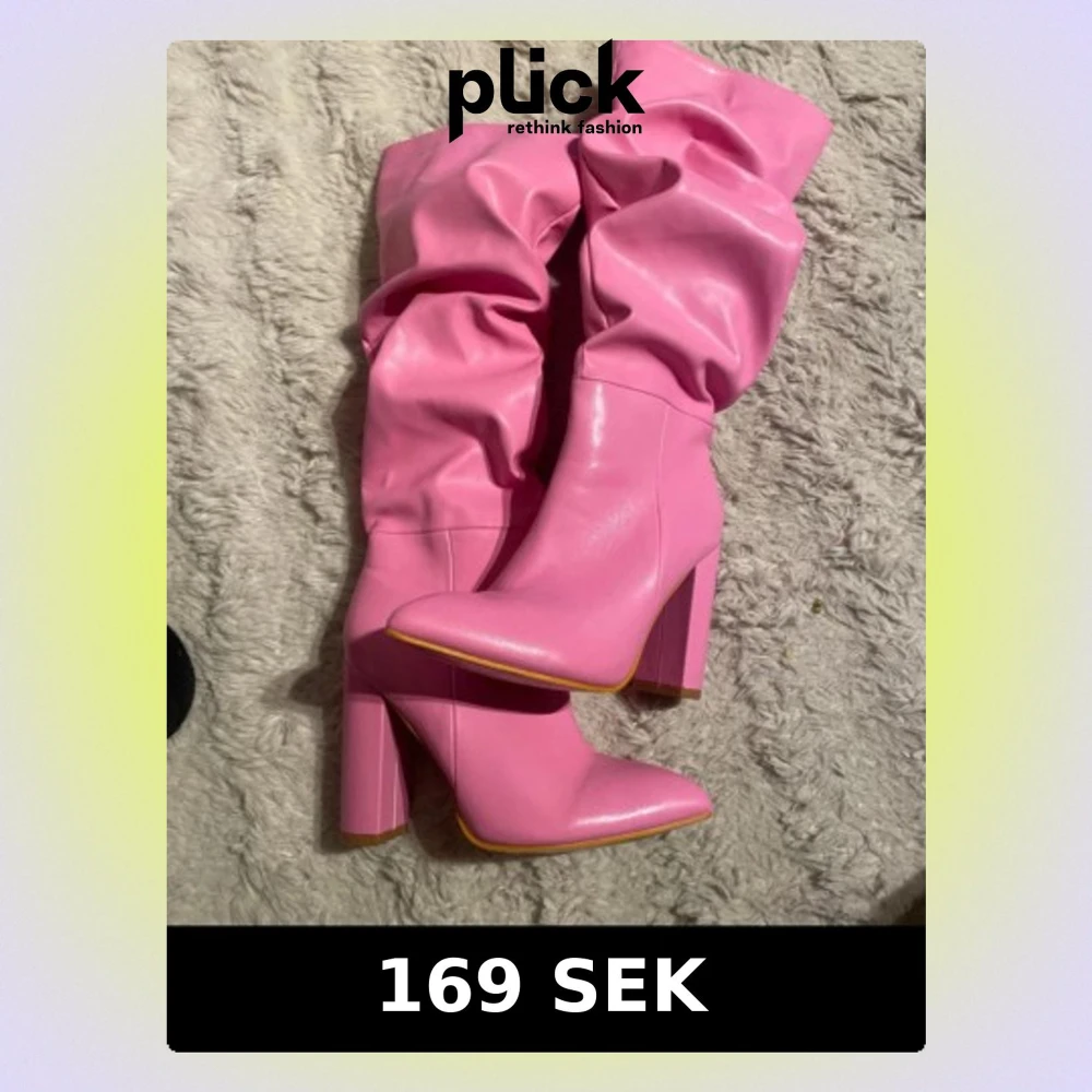 Säljer ett par höga stövlar i stark rosa färg med bred klack och spetsig tå. Stövlarna har en slouchy design och dragkedja på insidan. Tillverkade i ett glansigt syntetmaterial som ger en trendig look.