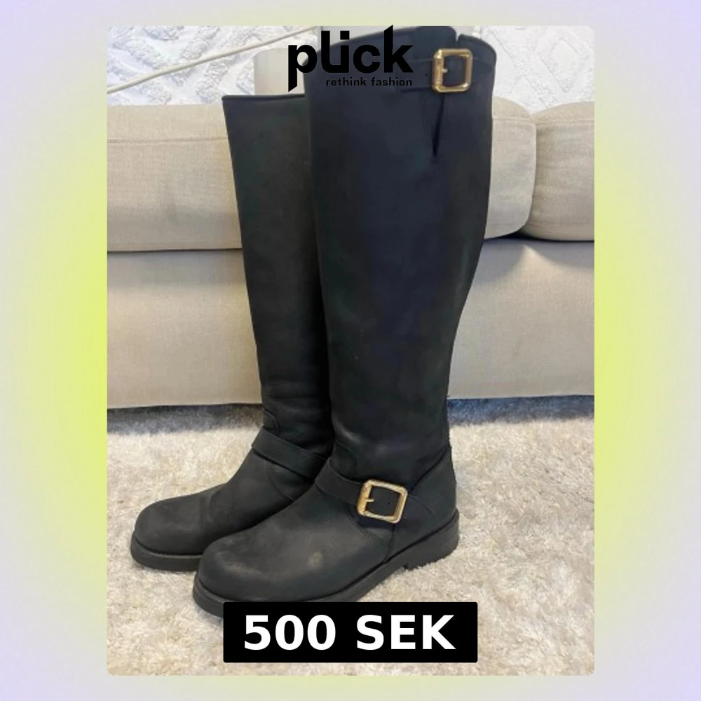 Snygga svarta höga stövlar i läderlook med guldfärgade spännen och dragkedjor baktill. Klassisk ridstövelstil med rund tå och grov sula. Perfekta för dig som vill ha en stilren och edgy look till hösten eller vintern.