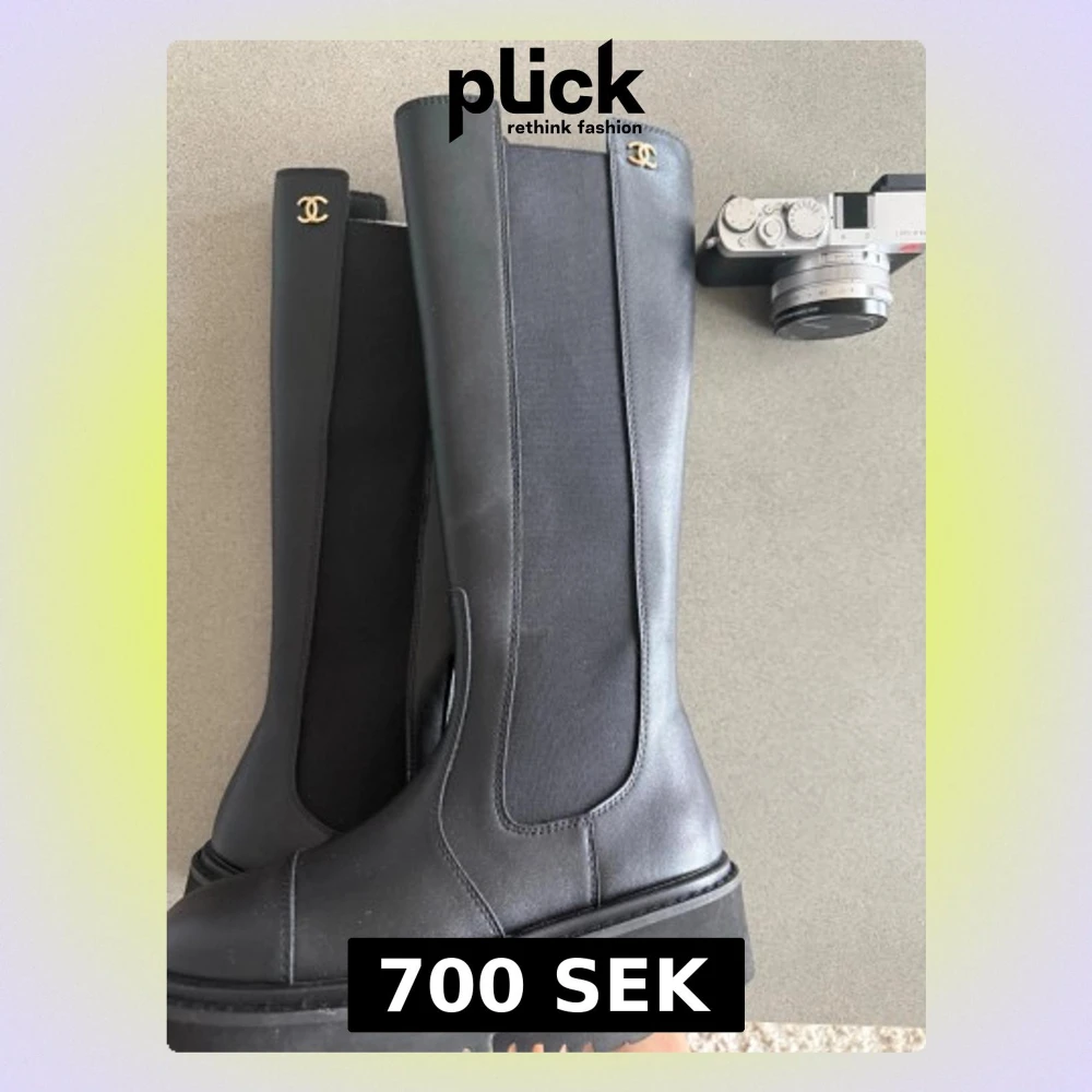 Säljer ett par svarta höga stövlar från C med chunky sula och guldfärgade logodetaljer upptill. Stövlarna är i skinn med elastiska partier på sidorna för skön passform. Perfekta för dig som vill ha en lyxig och trendig look.
