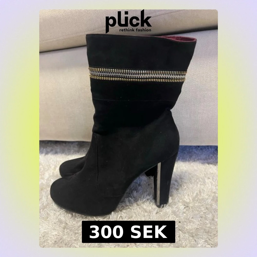 Svarta stövletter med höga klackar och dekorativa guldfärgade dragkedjor runt skaftet. Materialet är mocka-liknande och insidan har en mörkröd ton. Stövletterna har en dragkedja på baksidan för enkel på- och avtagning.