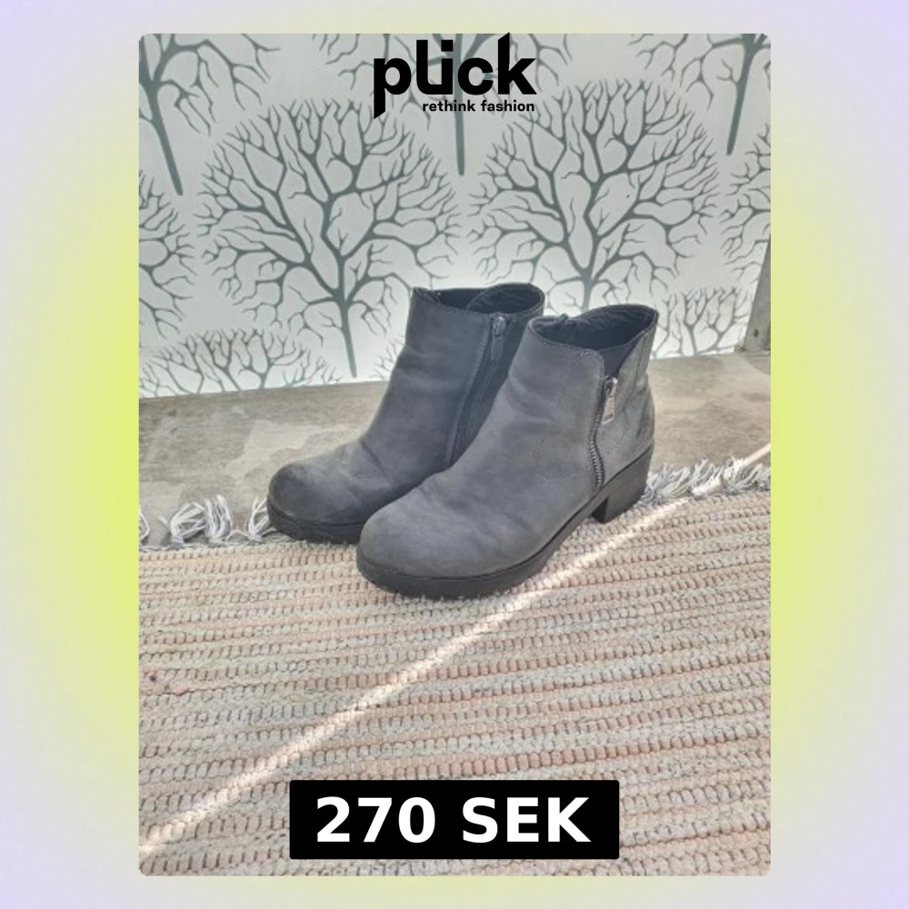 Snygga gråa stövletter med grov sula och låg klack. Skorna har dragkedja på sidan för enkel på- och avtagning och är tillverkade i ett matt, mockaliknande material. Perfekta till jeans eller kjol för en cool look.