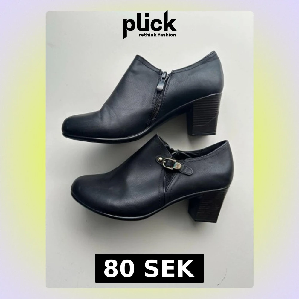 Superfina svarta högklackade ankelboots / stövletter med lågt skaft i veganskt konstläder. Storlek 39. Snygga till både jeans och klänning, riktigt klassisk modell. Mycket fint skick! Hämtas i Stockholm eller skickas mot porto.
