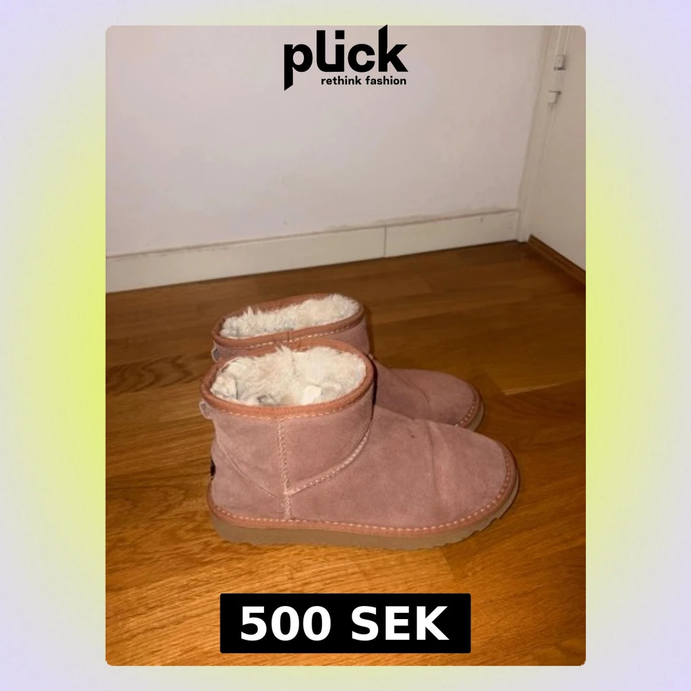 Mysiga rosaaktiga UGG boots i mocka med fluffigt vitt fårskinnsfoder. De har en låg modell med rund tå och grov sula i gummi. Perfekta för kalla dagar när du vill hålla fötterna varma och snygga.