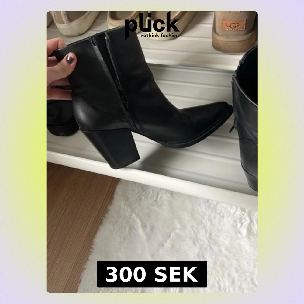 Snygga svarta stövletter i skinnimitation med spetsig tå och bred klack. Dragkedja på insidan för enkel på- och avtagning. Perfekta till höstens outfits och ger en edgy vibe till din look. Nästan som nya och ny pris är 700kr