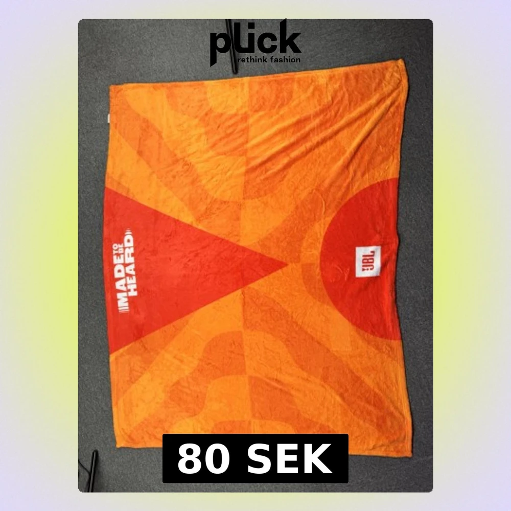 Stor och mjuk filt i orange och rött med grafiskt mönster och texten 'MADE TO BE HEARD' samt JBL-logga. Baksidan är vit.