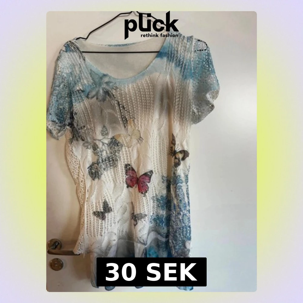 Säljer en luftig vit mesh topp med korta ärmar och blommigt mönster samt färgglada fjärilar. Toppen har blå detaljer upptill och nertill, samt transparent struktur som ger en cool och somrig vibe. Perfekt att styla över ett linne eller bikini. Rök och djurfritt hem. Pruta gärna 🌸