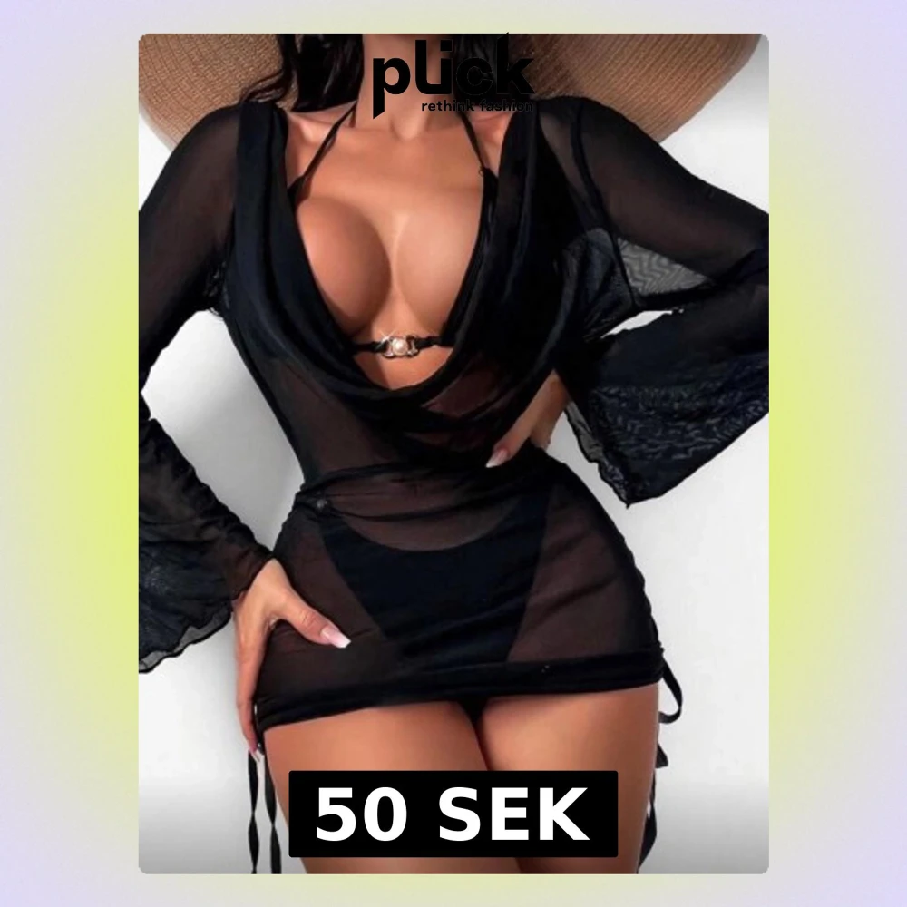 Säljer en svart, transparent strandklänning med långa, vida ärmar och djup urringning fram. Klänningen har en kort, figurnära passform och öppen rygg med knytband. Perfekt att bära över bikini på stranden. Materialet är tunt som ger en snygg och luftig look.