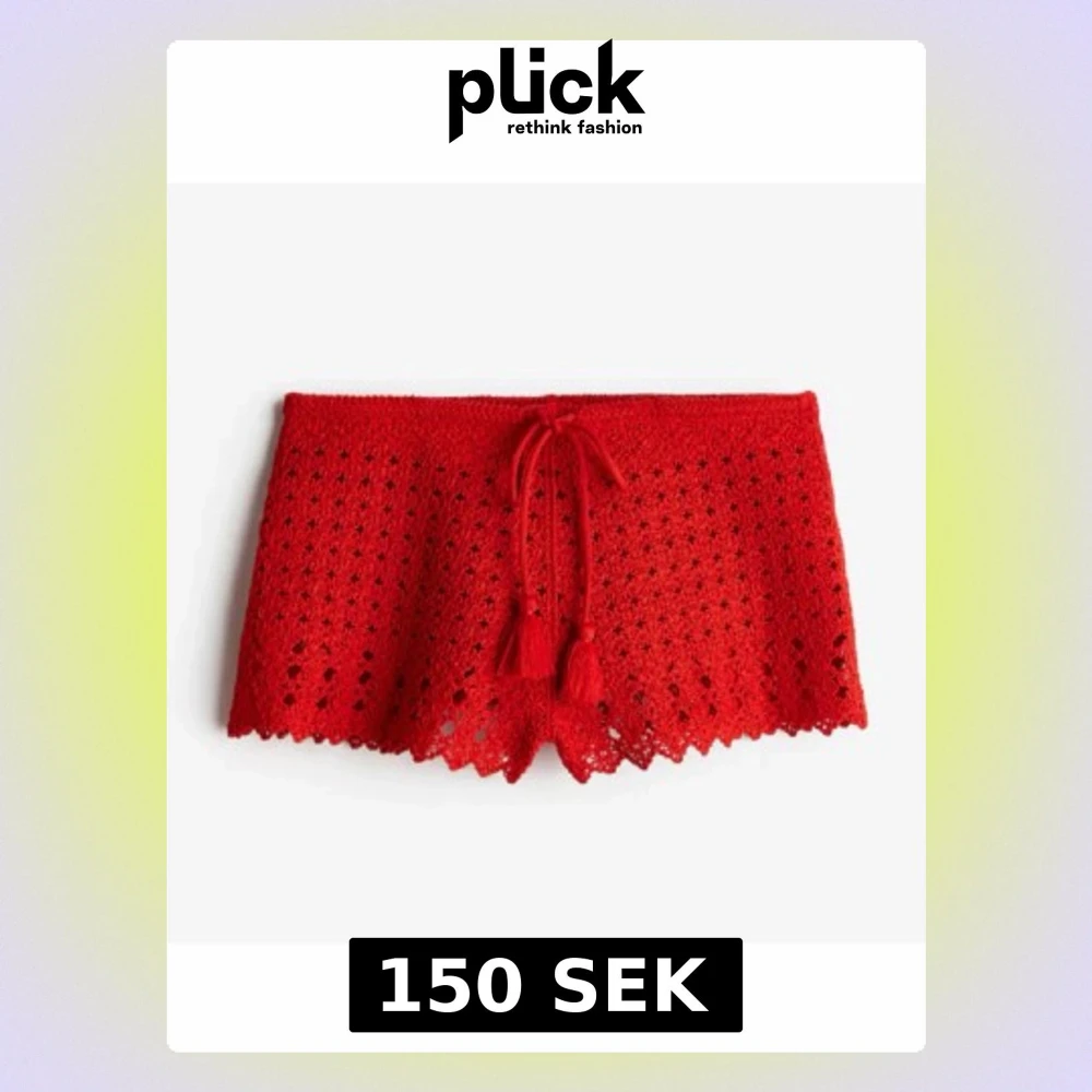 Snygga röda strandshorts i virkad design med dekorativt knytband och tofsar framtill. Shortsen har ett genombrutet mönster och vågig kant nedtill, perfekta att dra över bikinin på stranden. ❣️