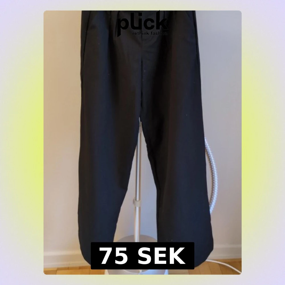 Säljer ett par svarta kostymbyxor med hög midja och vida ben. Kostymbyxorna har fickor både fram och bak. Perfekta för dig som gillar en avslappnad och trendig stil.