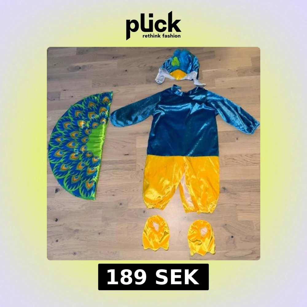 Färgglad påfågelkostym med glansigt blått överdel, gula byxben och avtagbar stjärt med påfågelfjädermönster. Hatten har blå fjädrar och grönt hjärta. Kostymen är i mjuk polyester och har tryckknappar för enkel påklädning. Perfekt för maskerad eller temadagar / halloween 🎃 🥰inköpspris: 599:-