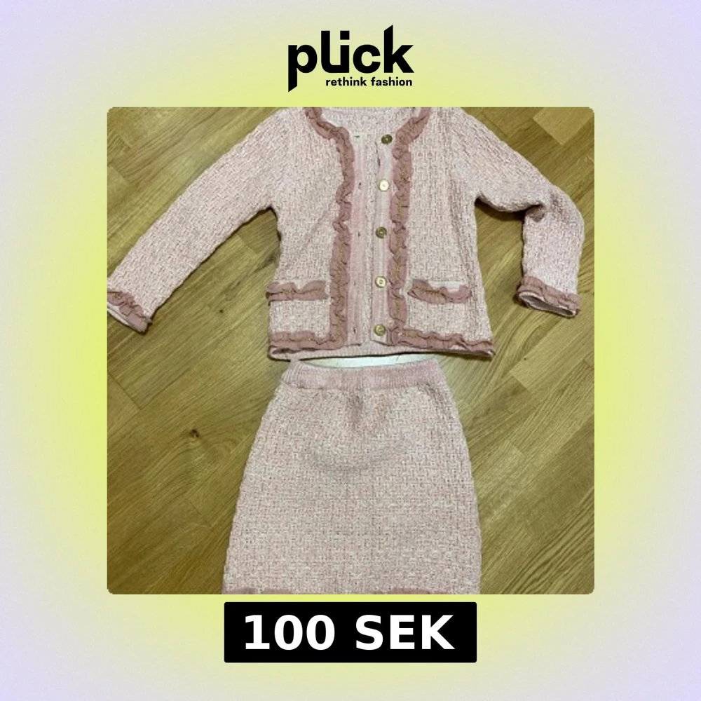 Säljer ett tvådelat kostymset i ljusrosa tweed med volangdetaljer. Setet består av en långärmad jacka med knappar och två fickor samt en matchande kjol med resår i midjan. Perfekt för dig som gillar en söt och klassisk stil.